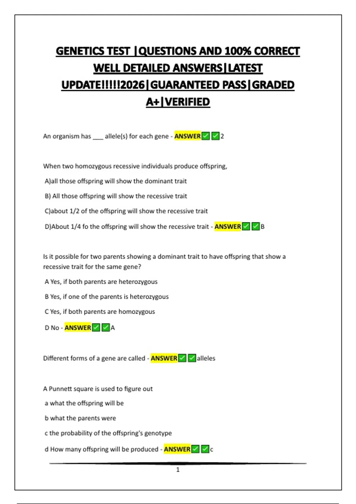 GENETICS TEST |QUESTIONS AND 100% CORRECT WELL DETAILED ANSWERS|LATEST UPDATE!!!!!2026|GUARANTEED PASS|GRADED A+|VERIFIED
