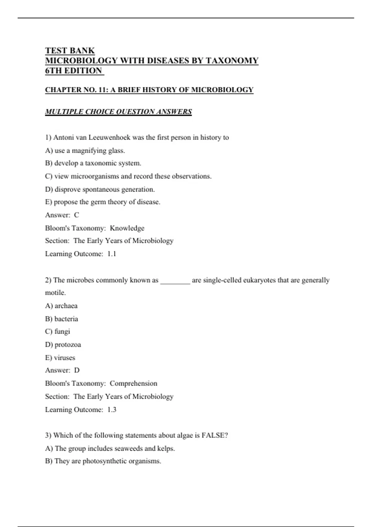 This document is a complete test bank for Microbiology with Diseases by Body System, 6th Edition by Robert W. Bauman. It includes chapter-based exam questions covering microbial structure and function, pathogenesis, immune responses, and diseases organized by body systems. The material is fully aligned with the 6th edition and is ideal for exam preparation, quizzes, and practice assessments in microbiology, nursing, and allied health programs.