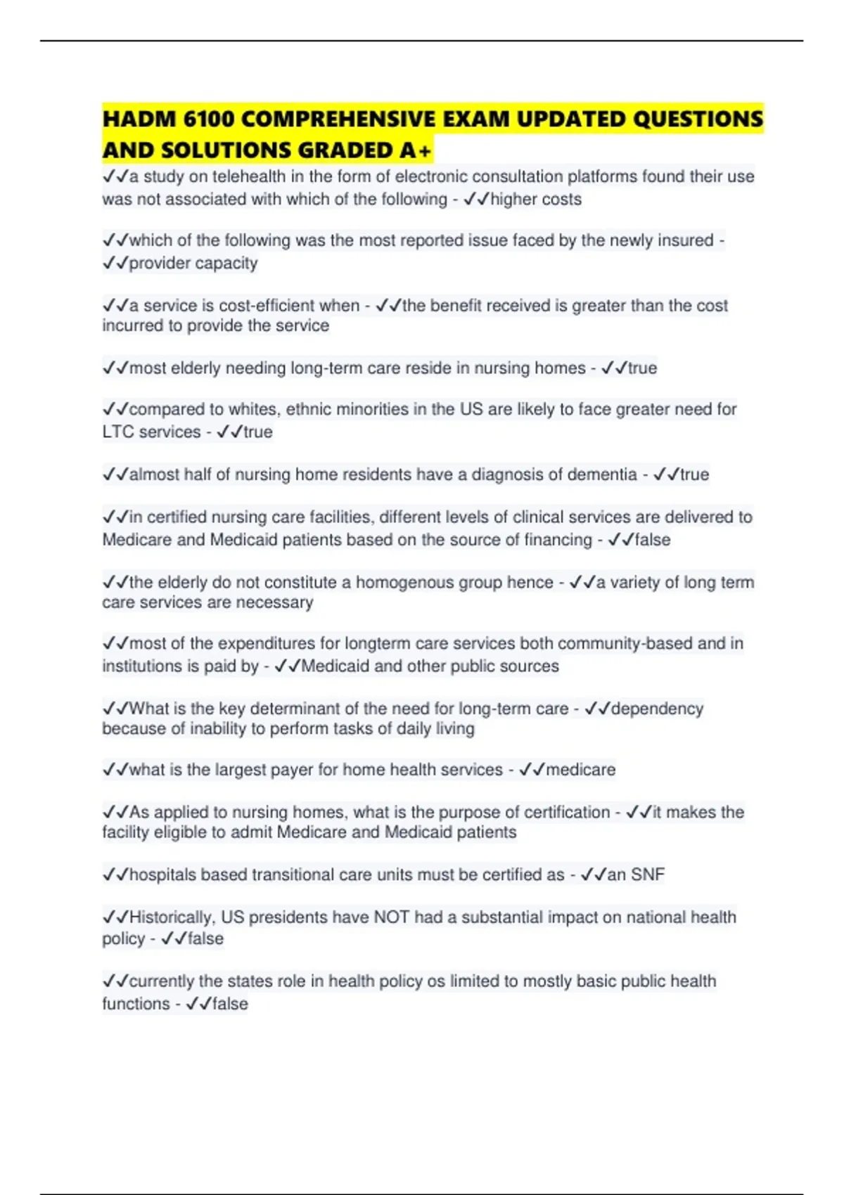 HADM 6100 COMPREHENSIVE EXAM UPDATED QUESTIONS AND SOLUTIONS GRADED A+