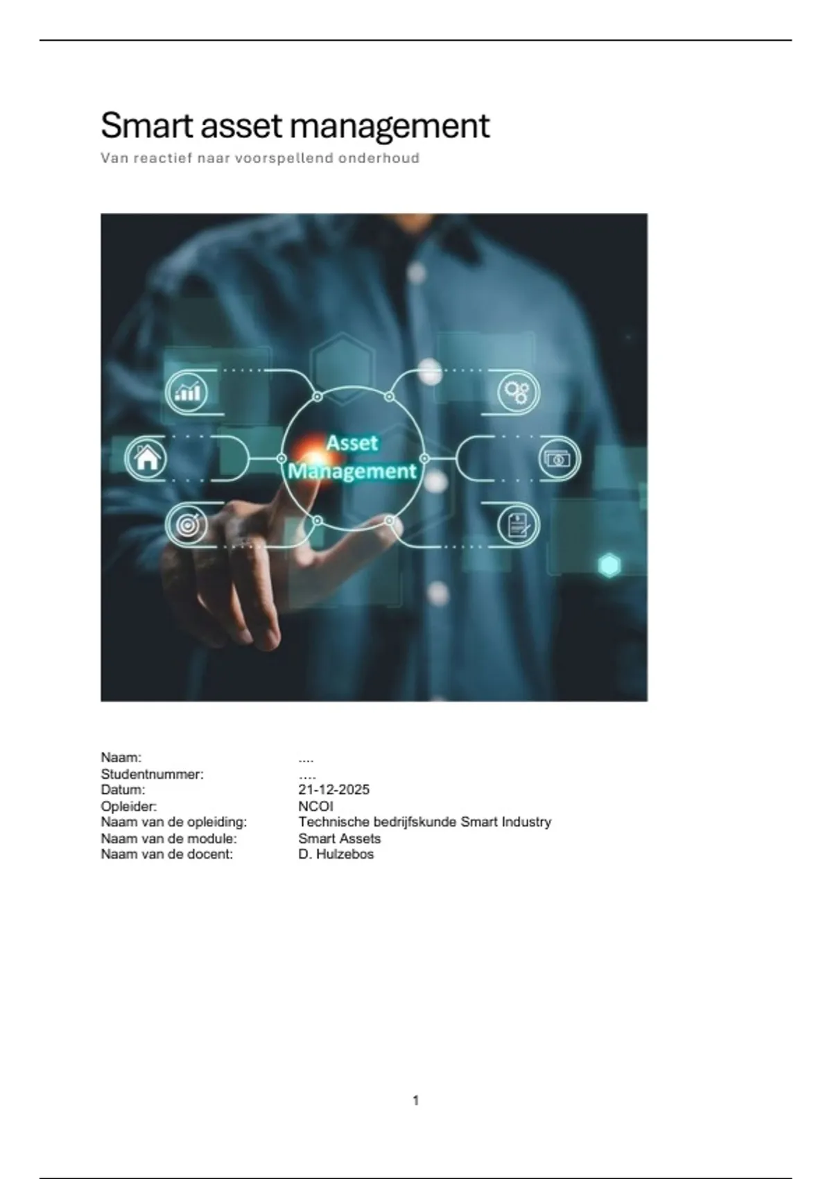 Beoordeling: Inhoud 1. Welke mate zijn de verplichte onderdelen in de uitwerking aanwezig? Naast alle verplichte onderdelen zijn extra relevante onderdelen aanwezig 2. In welke mate zijn de hoofdlijnen van de opdracht uitgewerkt conform stap 1 en 2? De hoofdlijnen van de opdracht zijn volledig uitgewerkt 3. In welke mate zijn relevante theorieën en/of modellen toegepast? Er zijn meer relevante theorieën en/of modellen dan gevraagd toegepast 4. In welke mate is de uitwerking theoretisch onderbouwd? De uitwerking bevat heldere en overtuigende theoretische onderbouwing Vorm Taalgebruik is leesbaar, begrijpelijk en correct Voldoet aan eis Structuur is logisch en navolgbaar Voldoet aan eis Literatuurverwijzing en -lijst zijn conform APA-normen of de Leidraad voor juridische auteurs Voldoet aan eis Cijfer 10 Opmerkingen Proficiat, dit is een voorbeeld van hoe een smart asset analyse gemaakt dient te worden. Dit is de module opdracht ter afsluiting van de module Smart Asset. In de opdracht staan meerdere theorieën uitgewerkt die tijdens de les naar voren komen. Dit document kan een handreiking bieden om jouw opdracht positief af te ronden.