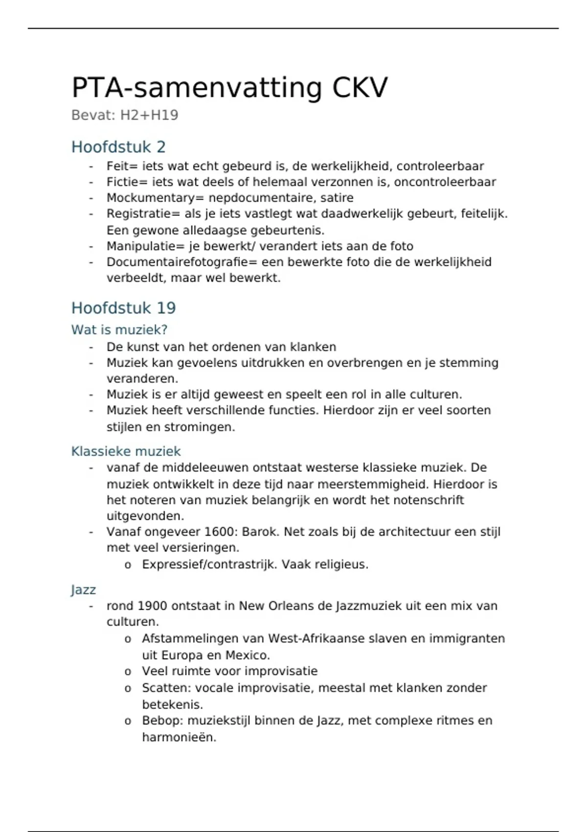 Deze PTA-samenvatting voor CKV VWO 4 behandelt hoofdstuk 2 en 19 en geeft een duidelijk overzicht van feit en fictie in kunst en media, evenals muziek als kunstvorm. Hoofdstuk 2 richt zich op begrippen zoals feit, fictie, registratie, manipulatie, documentairefotografie en mockumentary. Er wordt uitgelegd hoe de werkelijkheid kan worden vastgelegd en hoe deze beïnvloed of vervormd kan worden. Hoofdstuk 19 behandelt muziek en muziekstromingen, waaronder klassieke muziek, jazz, urban, rock en dance. Ook muzikale kenmerken zoals ritme, tempo, klankkleur, dynamiek en vorm komen aan bod. De samenvatting is overzichtelijk en geschikt voor PTA-toetsen.