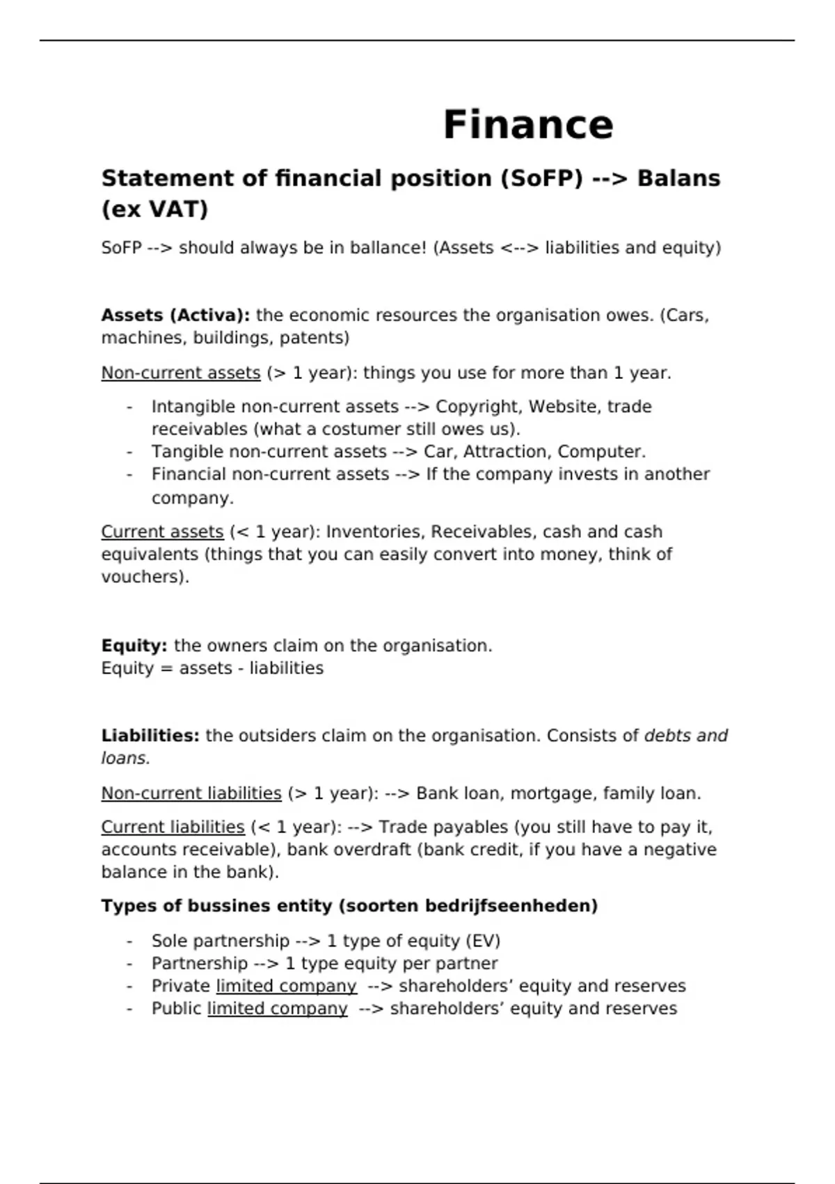 This summary is in English! Are you struggling with the theoretical side of finance? Then this is the perfect summary for you. It contains everything you need to know about the Statement of Financial Position, the Statement of Cash Flows, the Income Statement, break-even analysis, margin of safety, capacity, and more. With this foundation, you'll have a better understanding of the calculations and easily grasp the theory of finance.