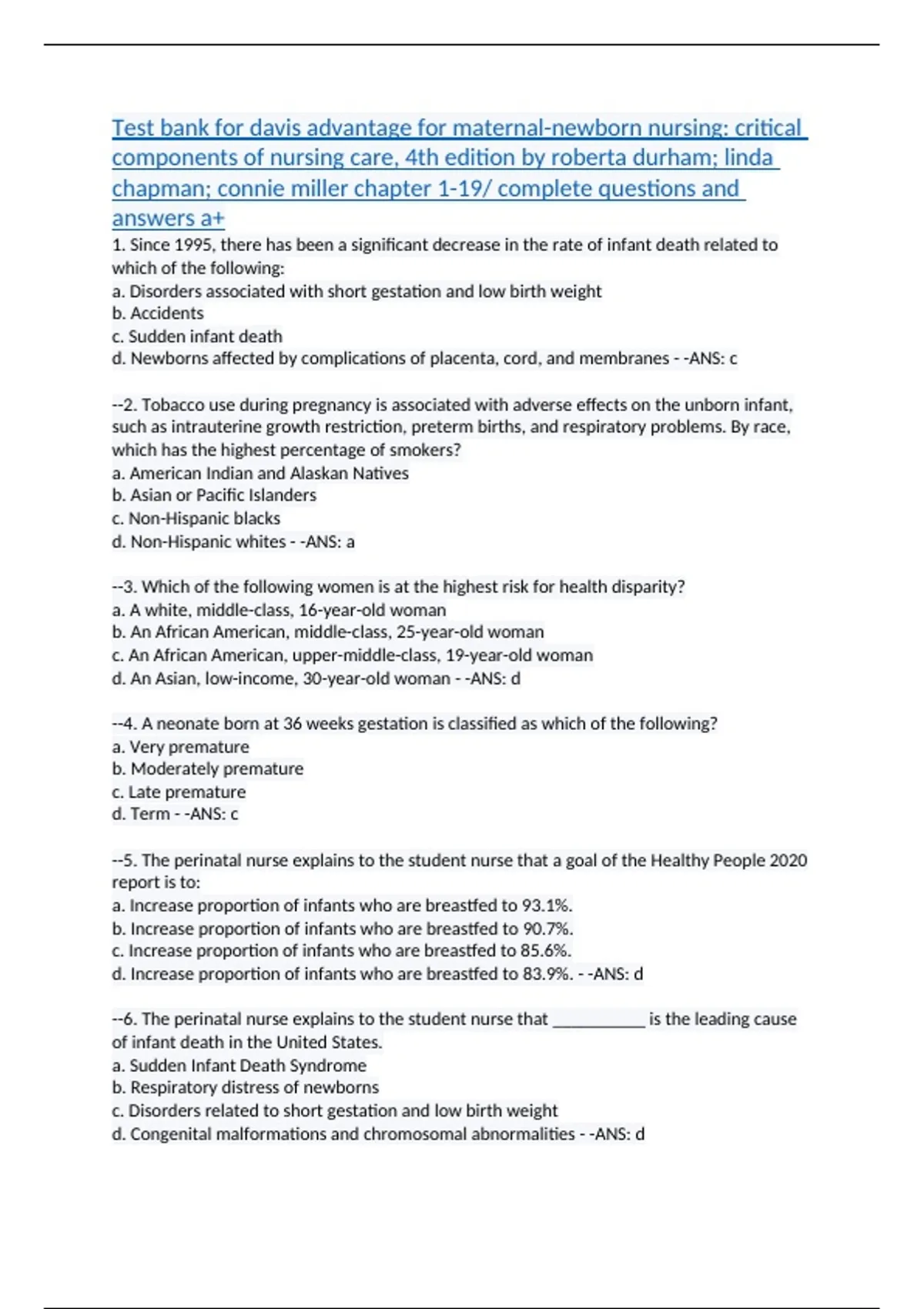 Test bank for davis advantage for maternal-newborn nursing: critical components of nursing care, 4th edition by roberta durham; linda chapman; connie miller ( ) / 9781719645737 / chapter 1-19/ complete questions and answers a+