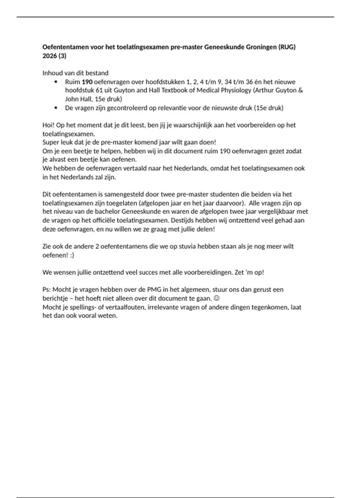 Inhoud van dit bestand • Ruim 190 oefenvragen over hoofdstukken 1, 2, 4 t/m 9, 34 t/m 36 én het nieuwe hoofdstuk 61 uit Guyton and Hall Textbook of Medical Physiology (Arthur Guyton & John Hall, 15e druk) • De vragen zijn gecontroleerd op relevantie voor de nieuwste druk (15e druk) Dit oefententamen is samengesteld door twee pre-master studenten die beiden via het toelatingsexamen zijn toegelaten (afgelopen jaar en het jaar daarvoor). Alle vragen zijn op het niveau van de bachelor Geneeskunde en waren de afgelopen twee jaar vergelijkbaar met de vragen op het officiële toelatingsexamen. Destijds hebben wij ontzettend veel gehad aan deze oefenvragen, en nu willen we ze graag met jullie delen!