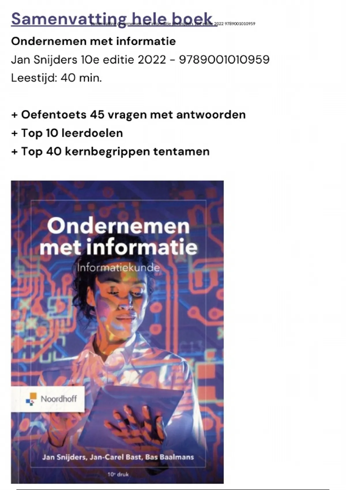 Samenvatting ondernemen met informatie jan snijders 10e editie 2022 9789001010959