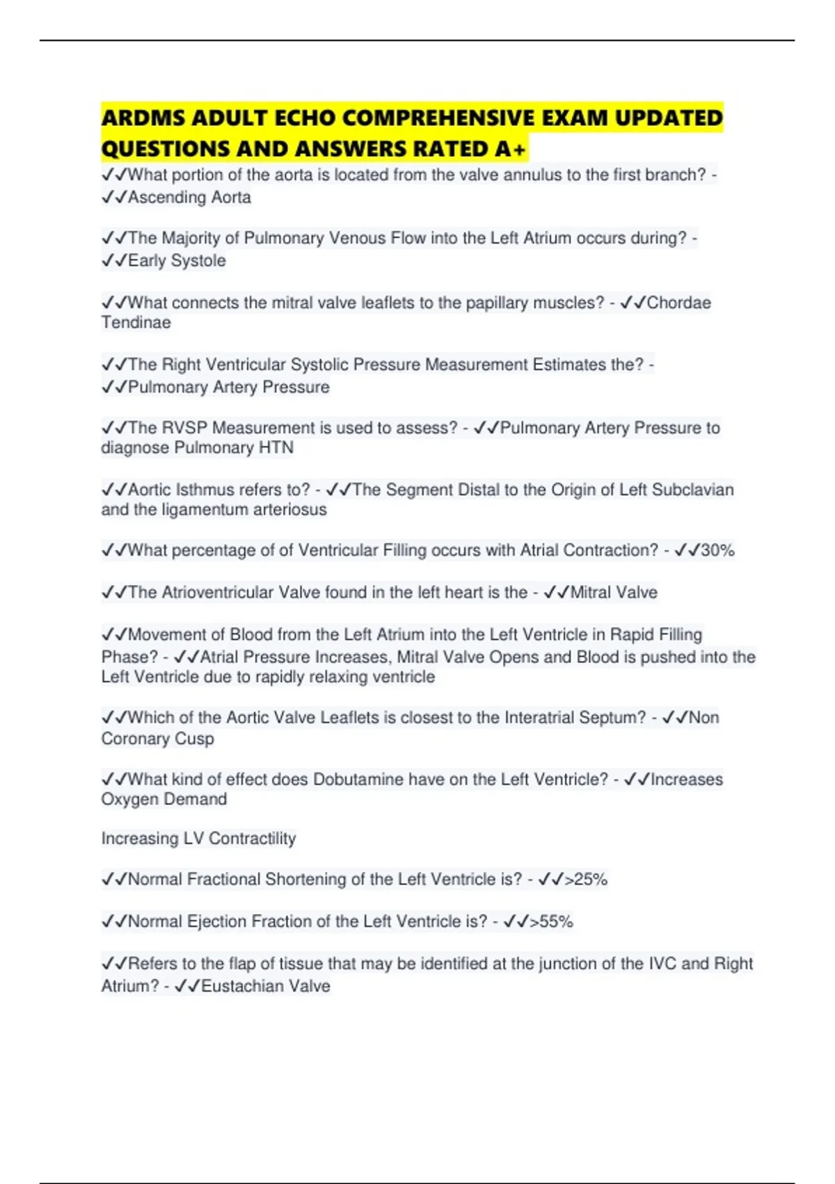 ARDMS ADULT ECHO COMPREHENSIVE EXAM UPDATED QUESTIONS AND ANSWERS RATED A+