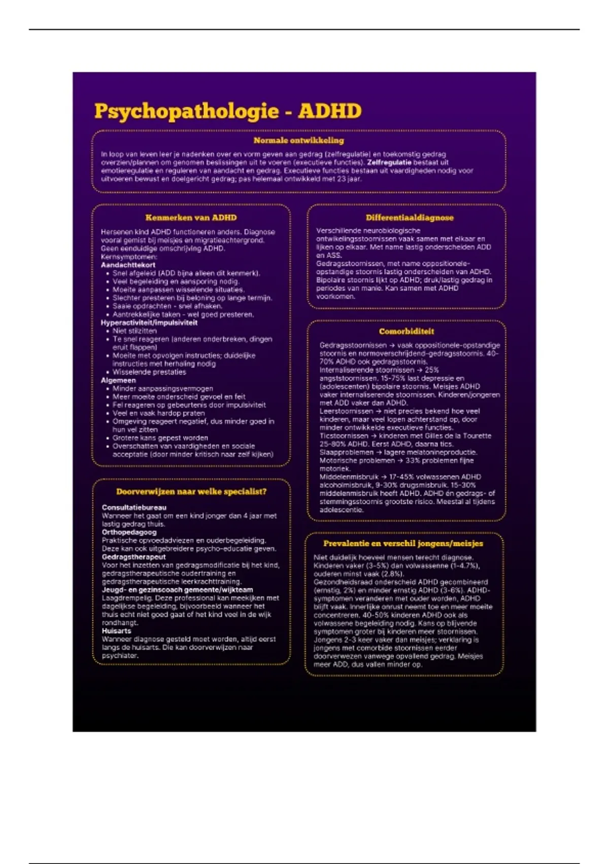 Een infographic over ADHD bij kinderen en jongeren, waarin zowel de gemiddelde ontwikkeling als de stoornissen behandeld worden. Er wordt ook gekeken naar differentiaaldiagnose, comorbiditeit, prevalentie, het verschil tussen jongens en meisjes, de belangrijkse behandeling, pedagogische handelingsadviezen, goede websites waarnaar verwezen kan worden en personen naar wie een jongeren of gezin doorverwezen kan worden.
