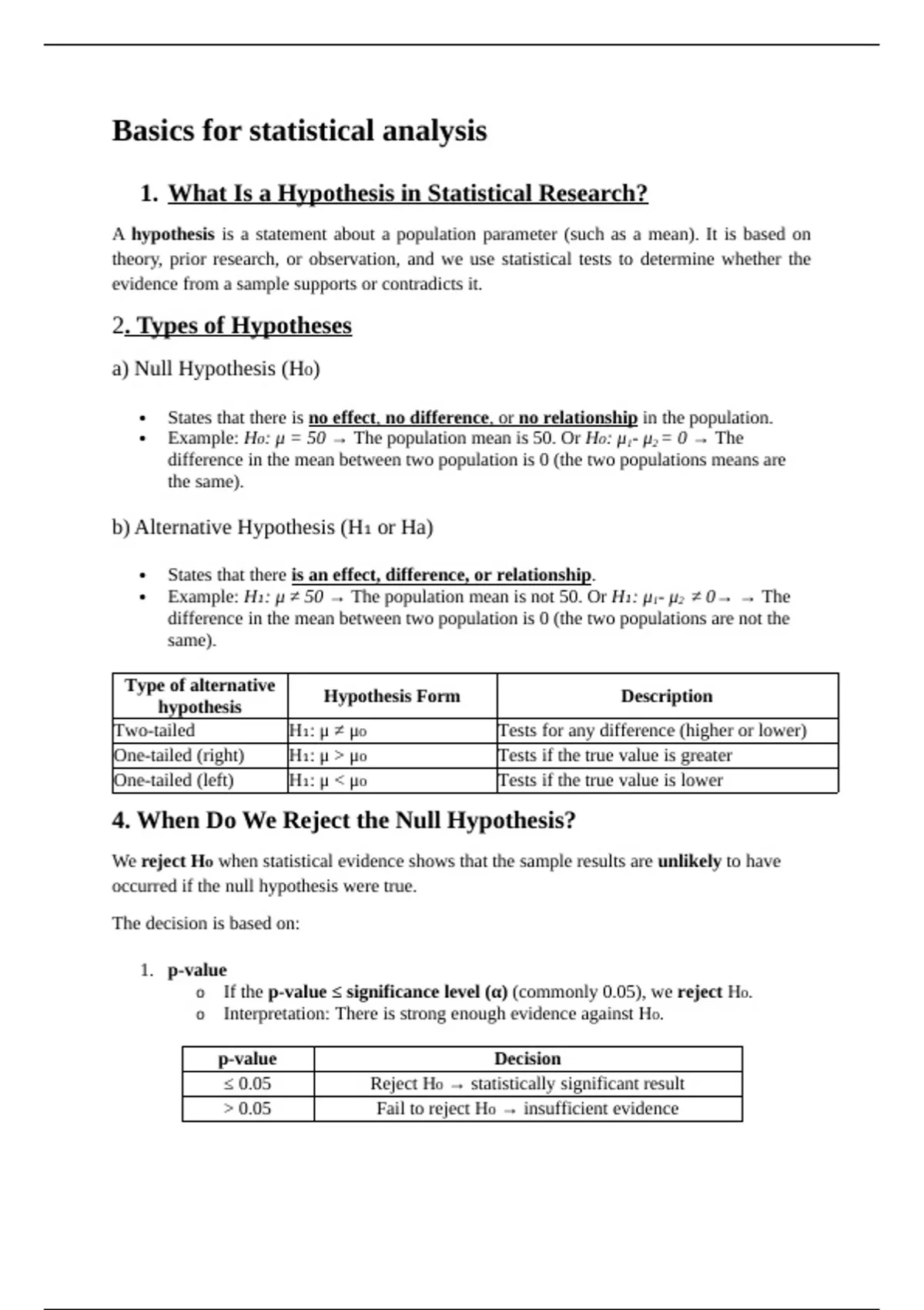 o If the p-value ≤ significance level (α) (commonly 0.05), we reject H₀.