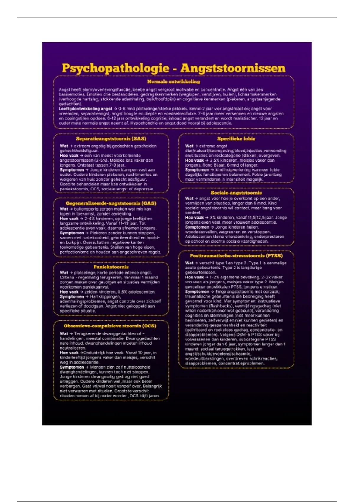 Een infographic over angststoornissen bij kinderen en jongeren, waarin zowel de gemiddelde ontwikkeling als de stoornissen behandeld worden. Er wordt ook gekeken naar differentiaaldiagnose, comorbiditeit, prevalentie, het verschil tussen jongens en meisjes, de belangrijkse behandeling, pedagogische handelingsadviezen, goede websites waarnaar verwezen kan worden en personen naar wie een jongeren of gezin doorverwezen kan worden.