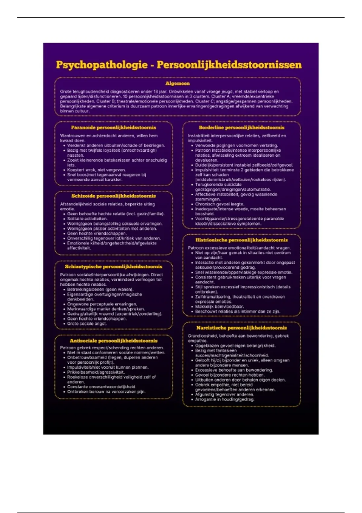 Een infographic over persoonlijkheidsstoornissen bij kinderen en jongeren, waarin zowel de gemiddelde ontwikkeling als de stoornissen behandeld worden. Er wordt ook gekeken naar differentiaaldiagnose, comorbiditeit, prevalentie, het verschil tussen jongens en meisjes, de belangrijkse behandeling, pedagogische handelingsadviezen, goede websites waarnaar verwezen kan worden en personen naar wie een jongeren of gezin doorverwezen kan worden.
