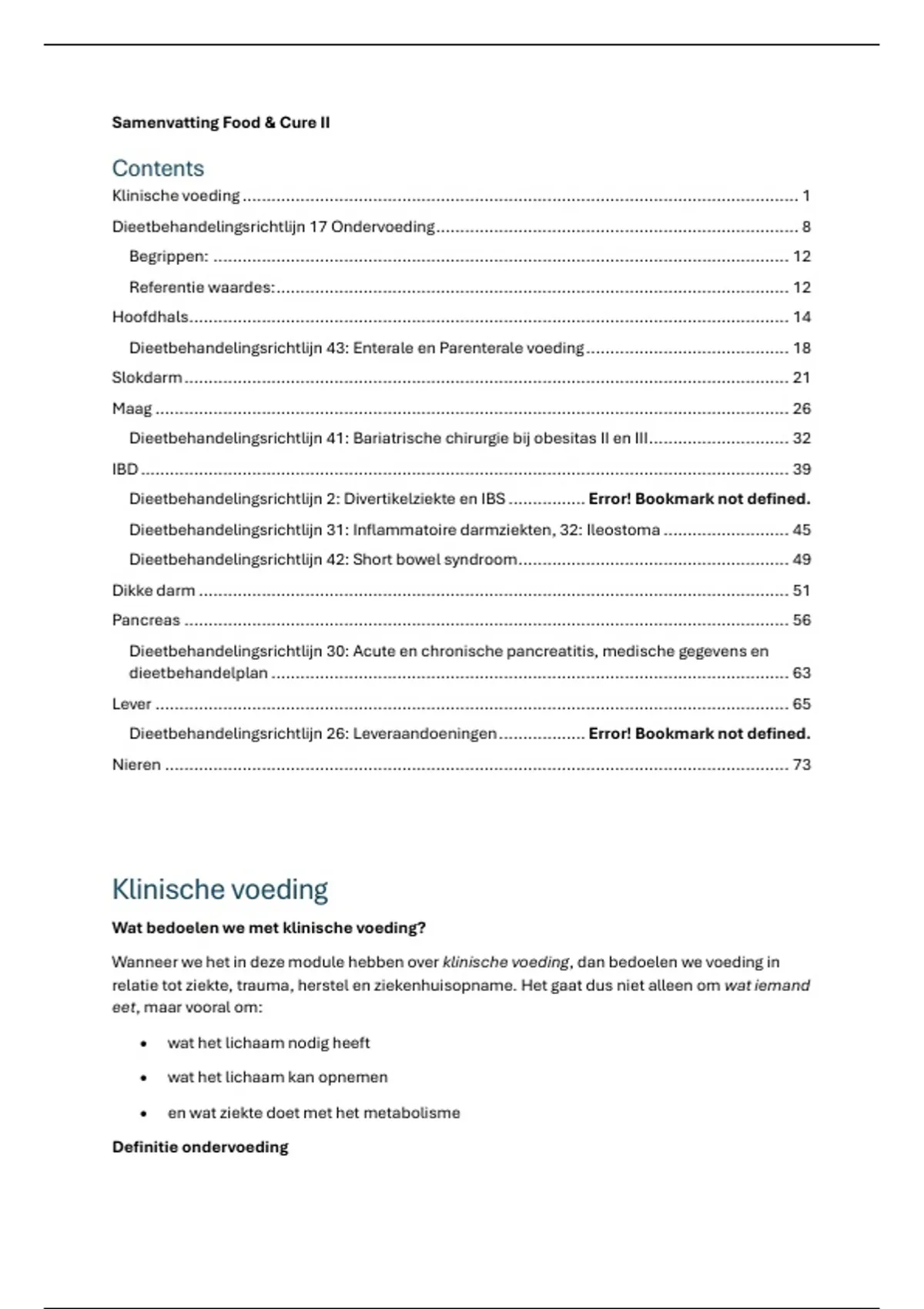 Dit is een uitgebreide samenvatting van alle stof, inclusief lessen, pathologie kennisklips, en zelfs dieetbhandelrichtlijnen. Alles is verdeeld per onderwerp, zoals de lessen zijn. Daarbij zijn er dus 9 hoofdstukken (hoofdhals, slokdarm, maag, dunne darm, dikke darm, pancreas en DM1, lever, en nieren). Ik heb de toets hierdoor met een ruime voldoende behaald.