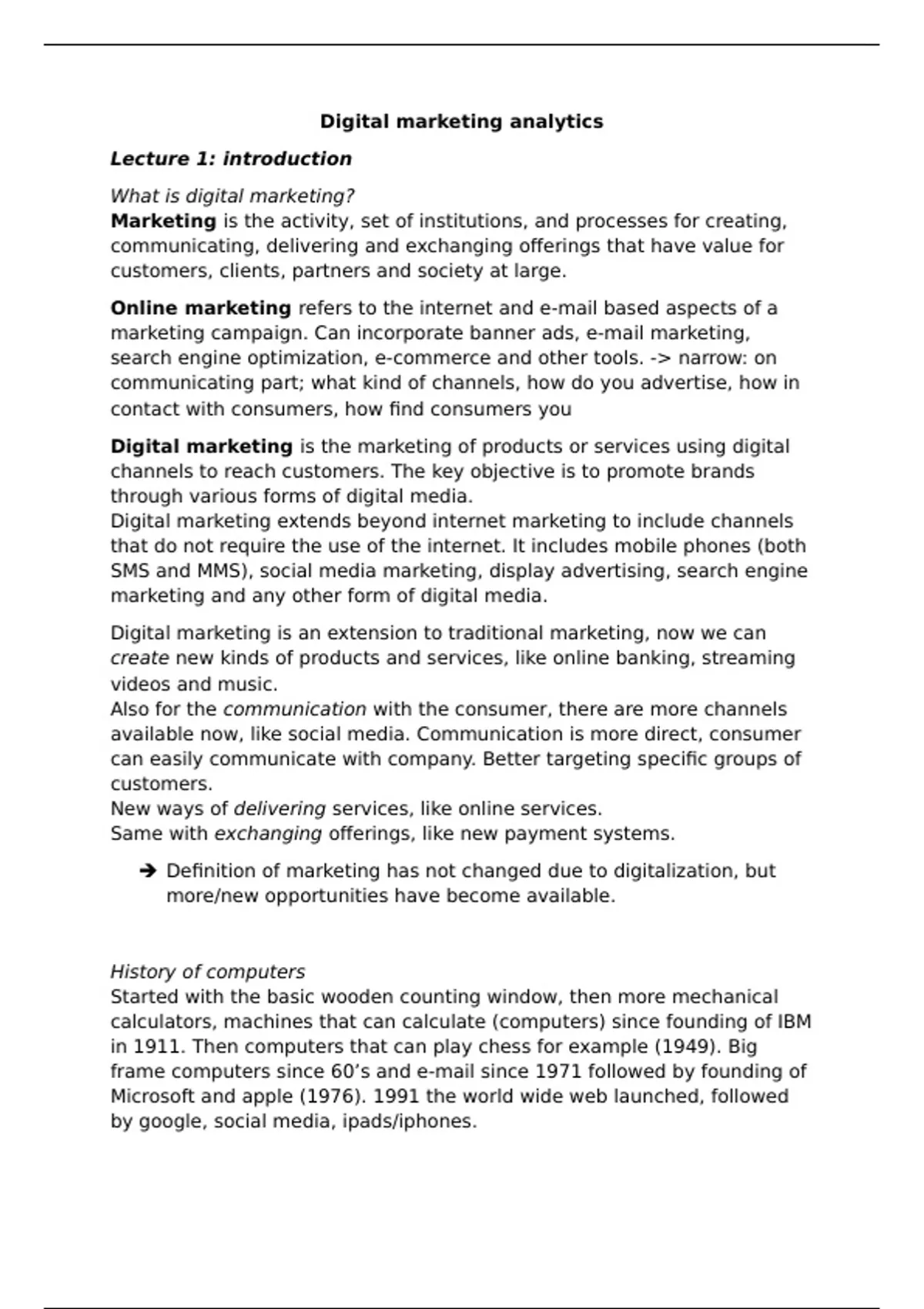 Dit document bevat alle informatie uit de colleges van het vak digital marketing analytics aan de RUG. Perfecte voorbereiding op je tentamen.