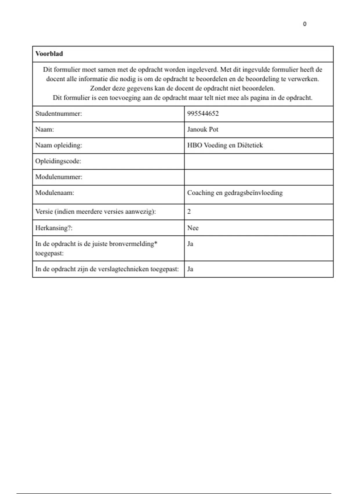 Dit formulier is een toevoeging aan de opdracht maar telt niet mee als pagina in de opdracht.