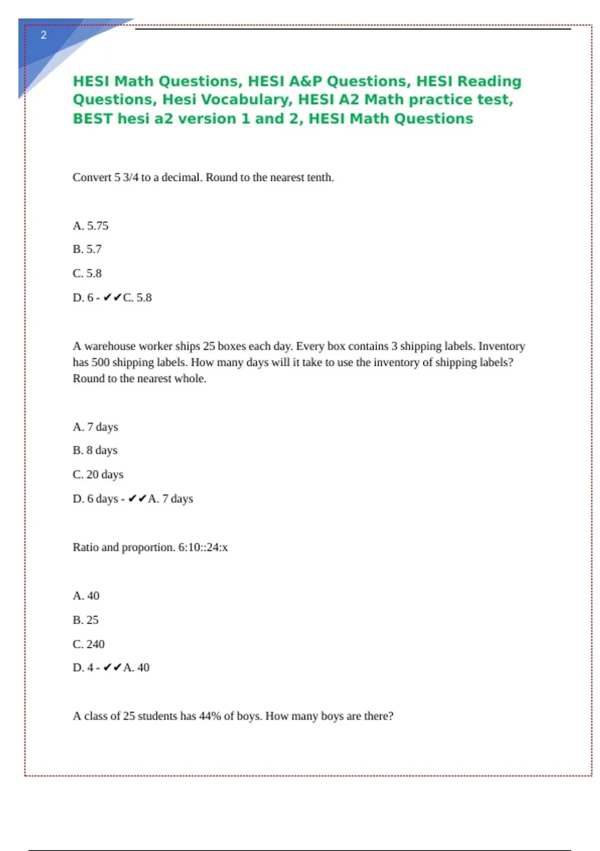 BEST hesi a2 version 1 and 2, HESI Math Questions || || || || || || || || ||