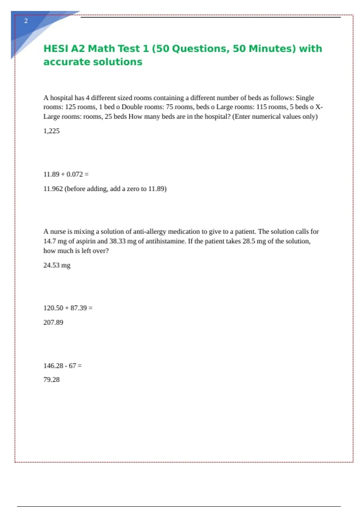 HESI A2 Math Test 1 (50 Questions, 50 Minutes) with accurate solutions