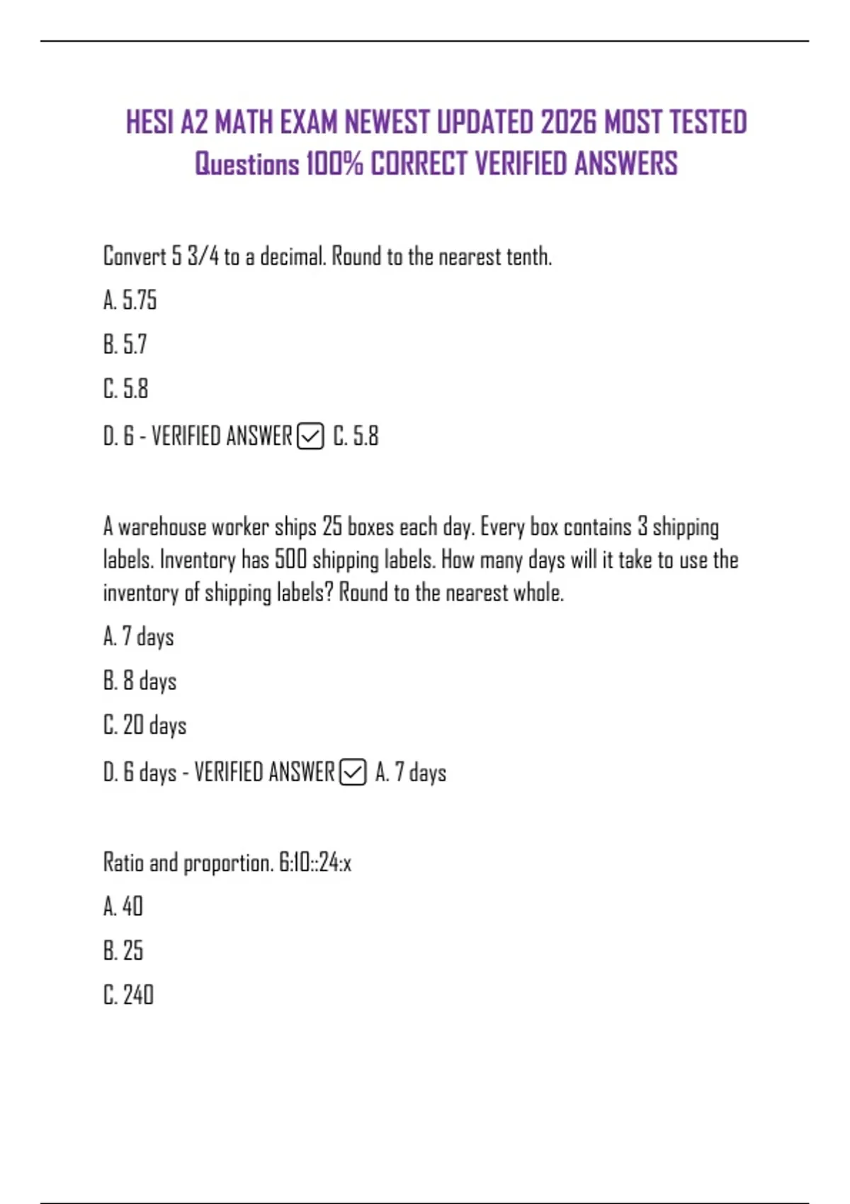 The HESI A2 Math Exam 2026 Test Bank is a fully updated, exam-accurate study resource designed to help nursing school applicants pass the HESI A2 Mathematics section on the first attempt. This guide includes most tested HESI A2 math questions, paired with 100% correct, verified answers that reflect the current exam format and difficulty level used by testing centers in 2026. Whether you struggle with fractions, ratios, conversions, or algebra basics, this resource focuses strictly on what actually appears on the exam—saving time and boosting confidence.
