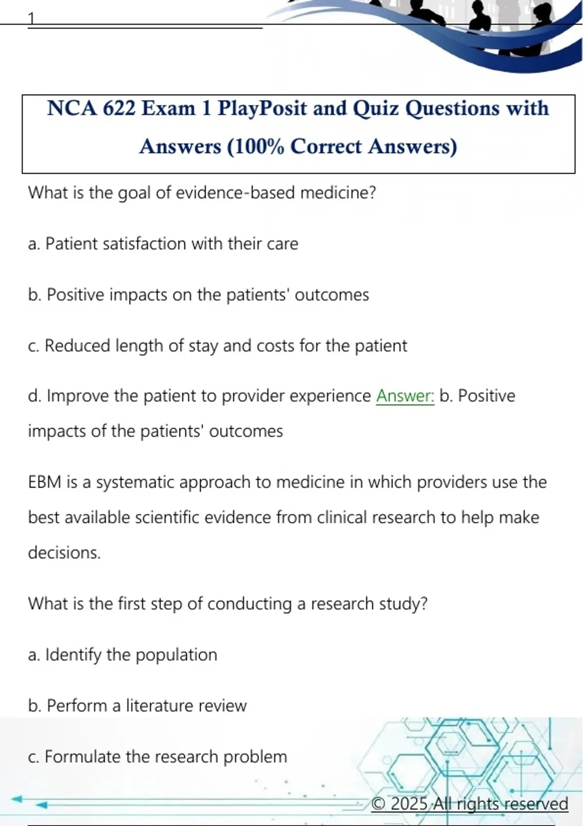 NCA 622 Exam 1 PlayPosit and Quiz Questions with Answers (100% Correct Answers) NCA 622 Exam 1 PlayPosit and Quiz Questions with Answers (100% Correct Answers)
