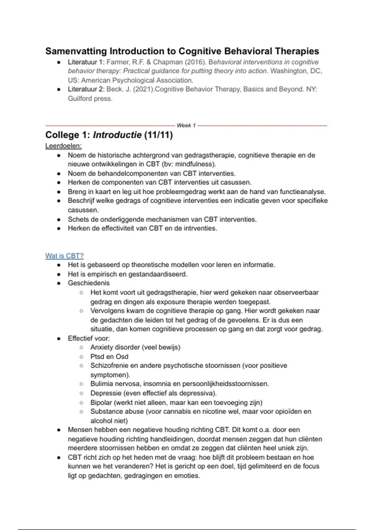 Deze samenvatting geeft een duidelijk en gestructureerd overzicht van alle stof voor het van introduction to CBT. Wanneer je deze stof beheerst, zou dat een goede basis moeten zijn om het vak met een voldoende af te ronden. Succes alvast!