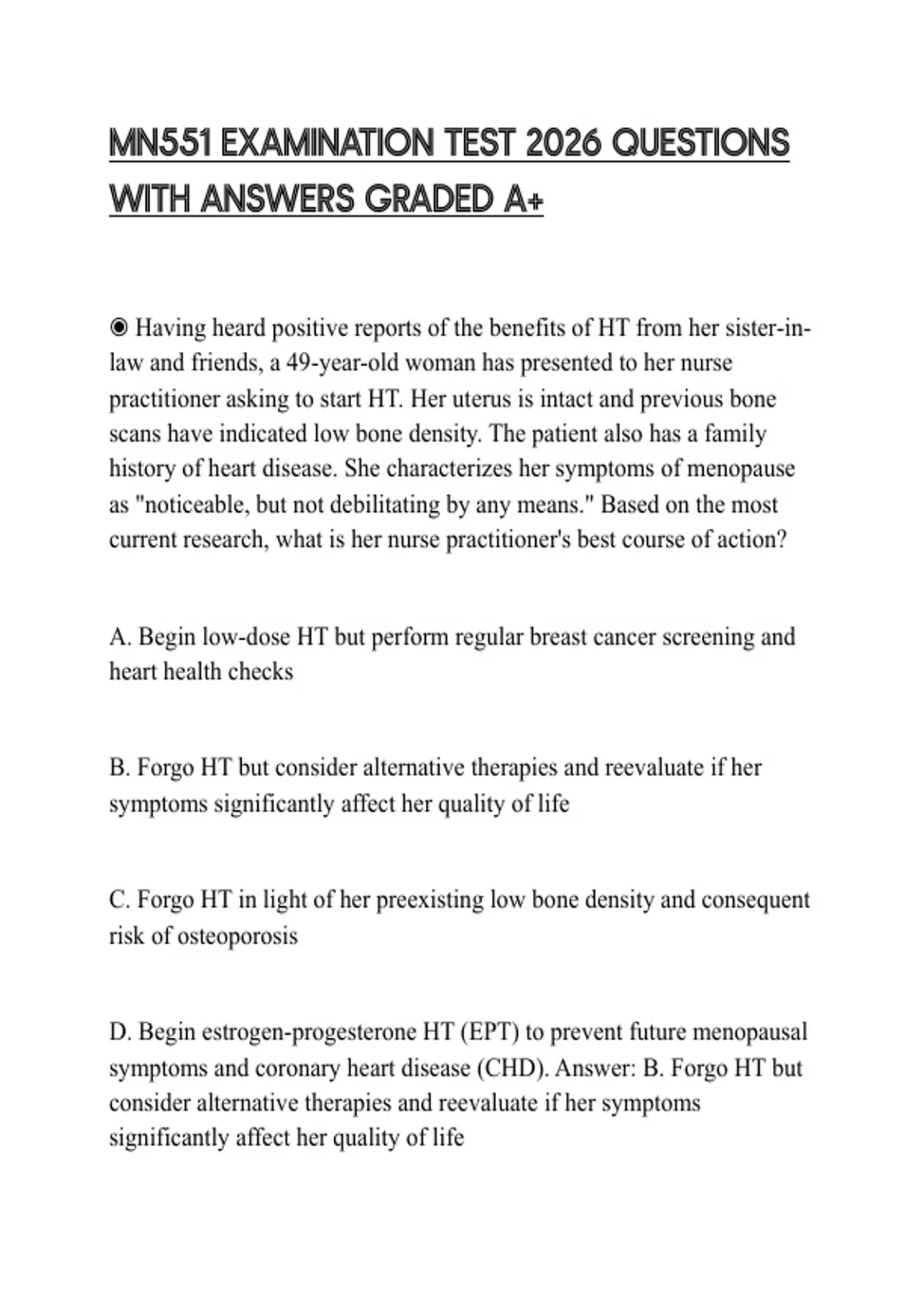 MN551 EXAMINATION TEST 2026 QUESTIONS WITH ANSWERS GRADED A+