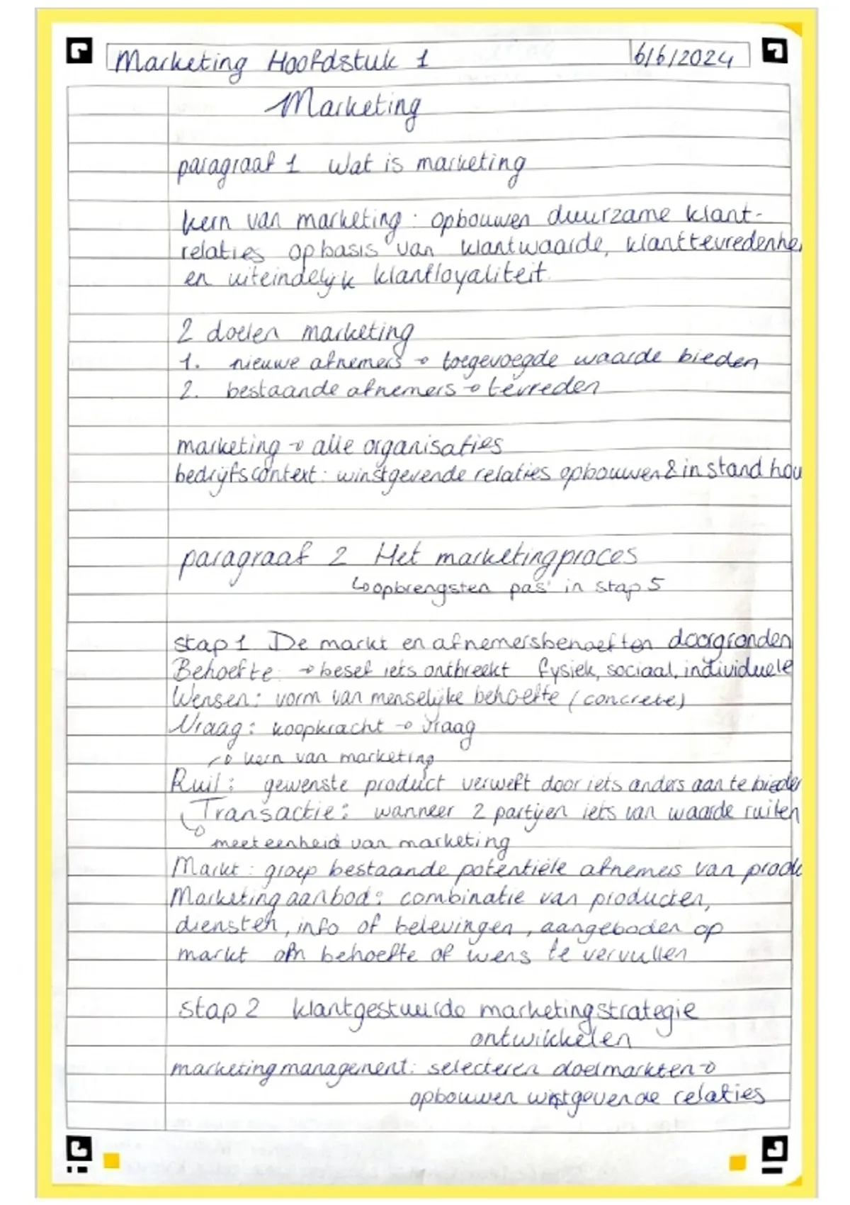 Zelf persoonlijk vind ik het fijn om samenvattingen te schrijven. Deze heb ik ingescand zodat deze goed te lezen zijn. Ik werk zelf vaak met bulletpoints en --> om verbanden te leggen. Een samenvatting op het eind met de verschillende onderwerpen per hoofdstuk die in het tentamen kunnen voorkomen maakt deze samenvatting compleet. Voor dit tentamen heb ik zelf een 8 gehaald.