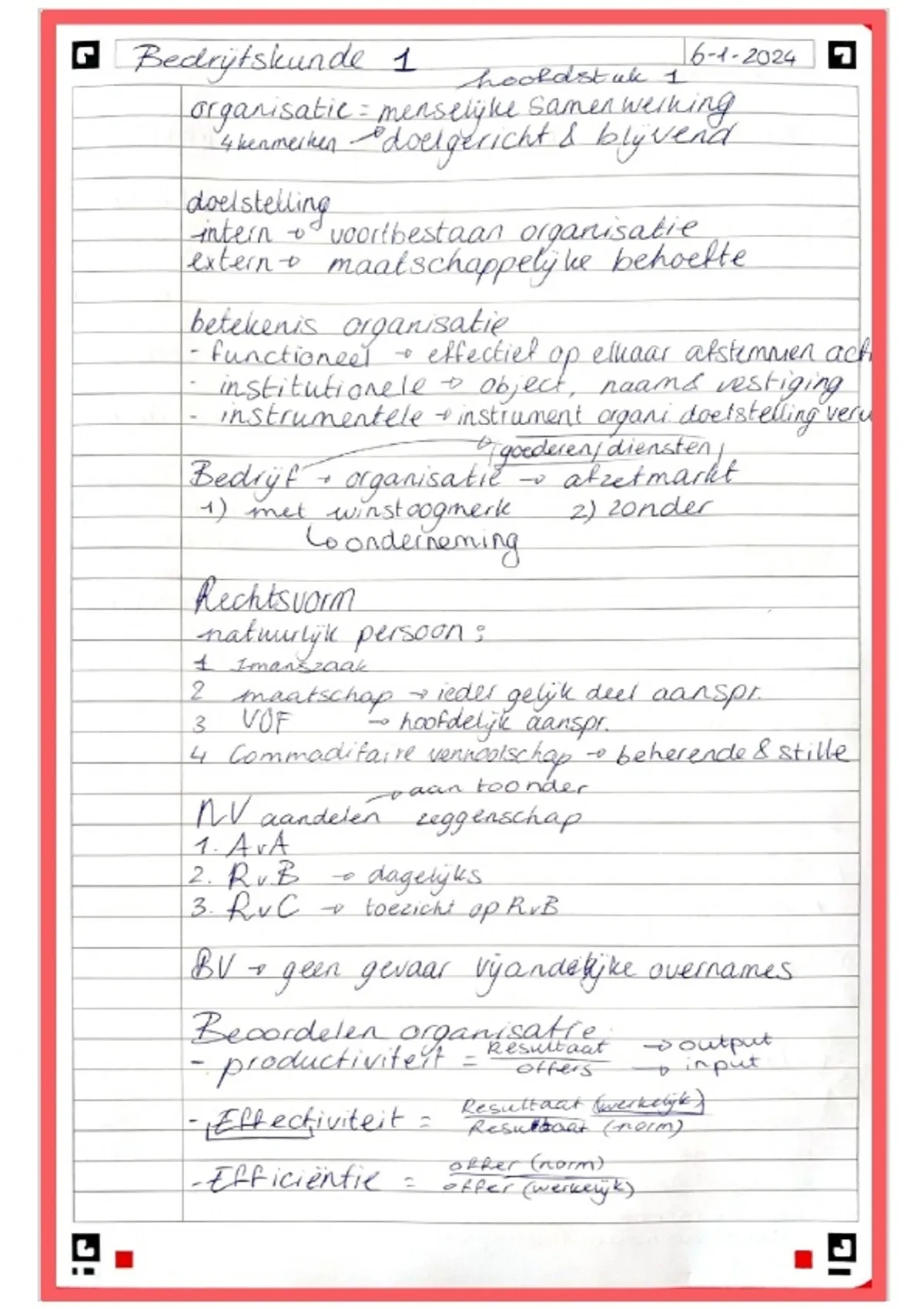 Mijn handgeschreven samenvatting zorgt voor overzicht en duidelijke opsommingen. De lastigste onderwerpen heb ik nog een keer achter in de samenvatting staan. Deze zijn goed om voor het leren punt voor punt af te gaan, kun je ze uitleggen? Van wie is het model etc.