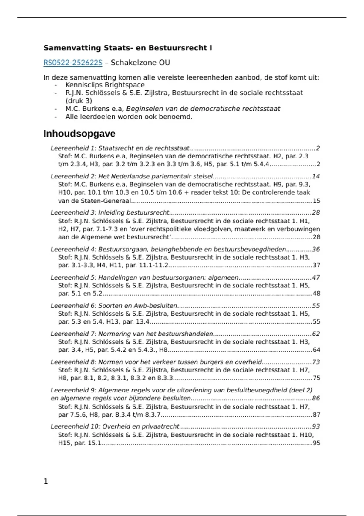 Hierbij bied ik aan mijn uitgebreide en complete samenvatting voor het vak Staats- en Bestuursrecht I. Geschreven in 2026. In deze samenvatting komen alle vereiste leereenheden aanbod, de stof komt uit: - Kennisclips Brightspace - R.J.N. Schlössels & S.E. Zijlstra, Bestuursrecht in de sociale rechtsstaat (druk 3) - M.C. Burkens e.a, Beginselen van de democratische rechtsstaat - Alle leerdoelen worden ook benoemd. Ik verkoop ook een kortere samenvatting voor dit vak waarin alle leerdoelen worden beantwoord. En een uitgebreide samenvatting van de jurisprudentie die bij de leereenheden worden benoemd. Mocht je vragen hebben, laat het gerust weten.
