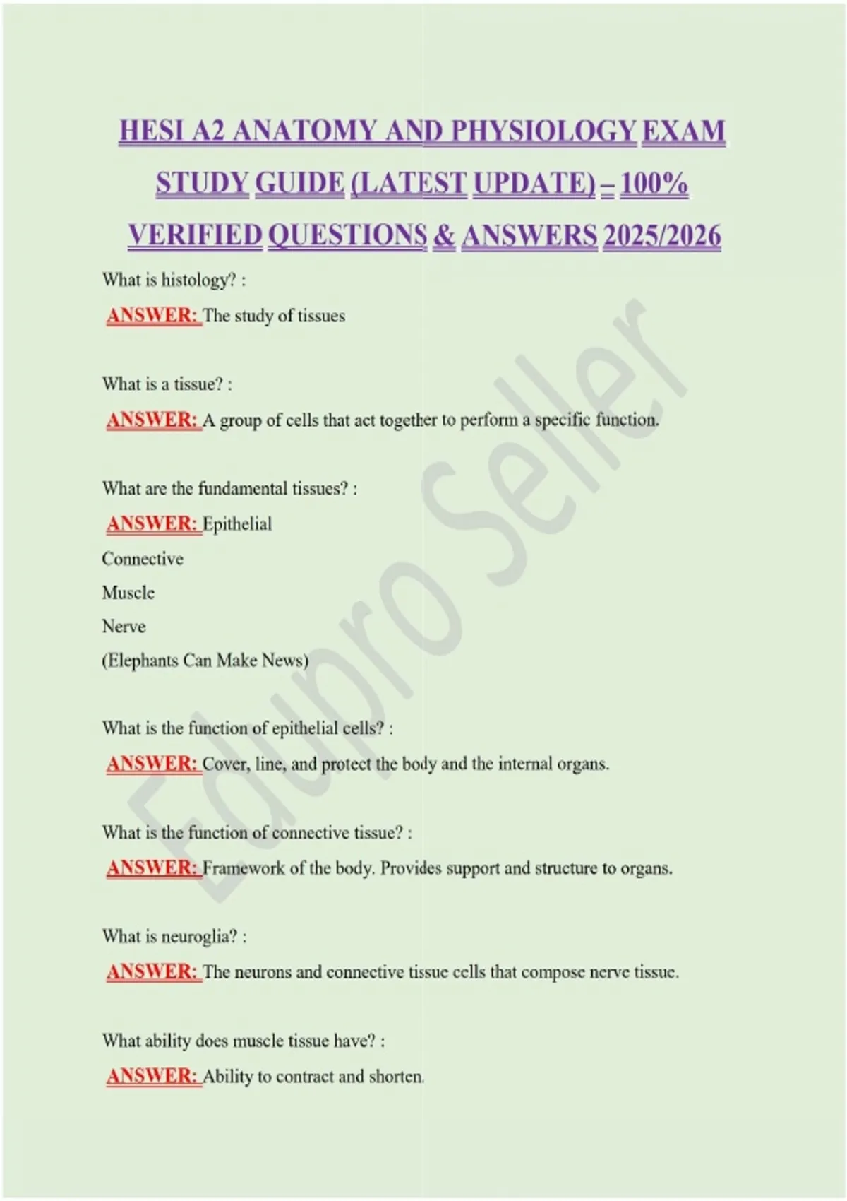 HESI A2 ANATOMY AND PHYSIOLOGY EXAM STUDY GUIDE QUESTIONS (LATEST UPDATE) –100% VERIFIED QUESTIONS & ANSWERS 2025/2026