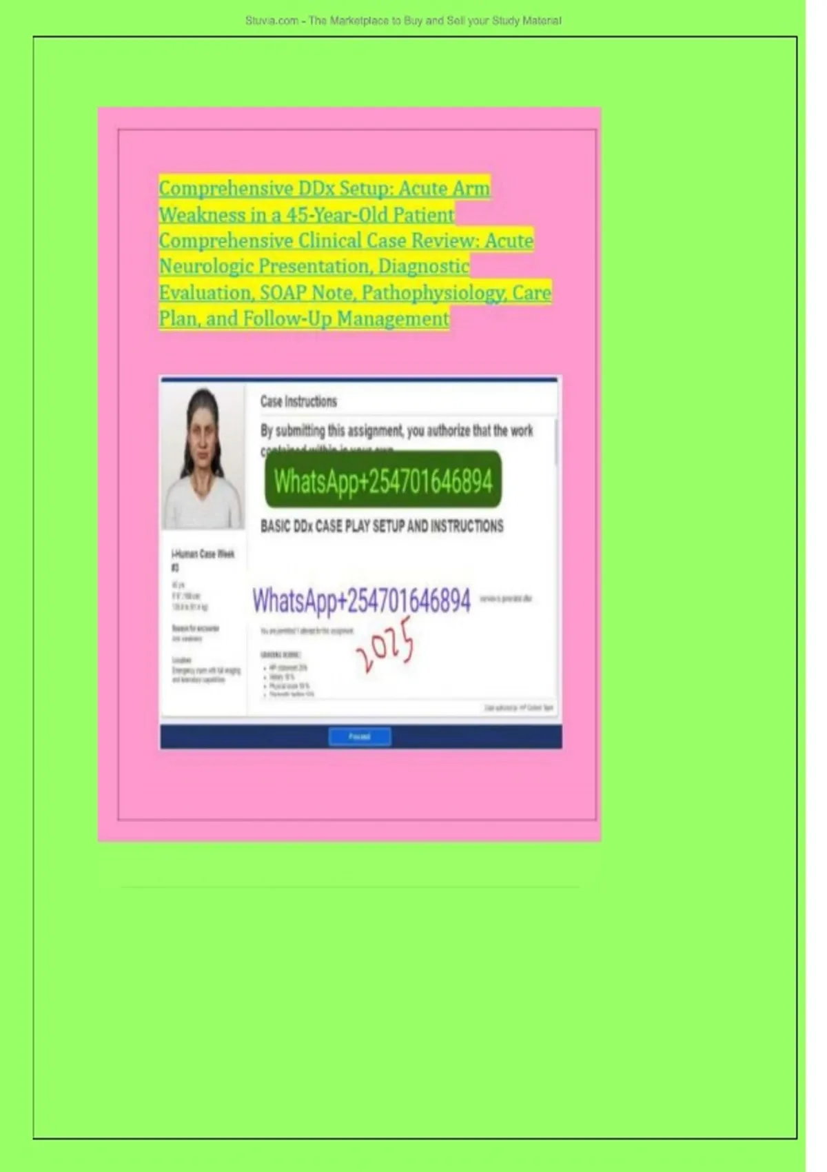 Master acute neurological assessment and stroke management with this detailed clinical case study focused on a 45-year-old patient presenting with acute right arm weakness. Designed for medical, nursing, PA, and NP students, this comprehensive walkthrough covers everything from focused history-taking and exam techniques to imaging interpretation, differential diagnosis, and evidence-based treatment planning. What’s Included in This Complete Case Analysis: Patient Presentation Overview – Chief complaint, demographics, onset, and clinical setting Focused History & Key Questions – Systematic approach to onset, associated symptoms, PMH, medications, and risk factors Step-by-Step Physical & Neurological Exam – Motor/sensory grading, reflex testing, coordination, and cranial nerve assessment Key Clinical Findings – Differentiating between stroke, TIA, radiculopathy, and other mimics Diagnostic Tests & Imaging – CT, MRI, CTA, carotid ultrasound, echocardiogram, and essential labs Differential Diagnosis Table – Compare ischemic stroke, TIA, hemorrhagic stroke, cervical radiculopathy, MS, and functional disorders Final Diagnosis & Rationale – Clinical reasoning leading to left MCA ischemic stroke SOAP Note Template – Ready-to-use documentation example Acute & Long-Term Management Plan – tPA/thrombectomy criteria, antiplatelet therapy, BP/statin management, rehab referral Follow-Up & Monitoring Schedule – Outpatient neurology visits, imaging reviews, lifestyle counseling Why This Case Study Is Essential for Your Training: Builds clinical reasoning skills for acute neurological presentations Provides a clear diagnostic pathway from presentation to treatment Prepares you for neurology rotations, shelf exams, and USMLE Step 2 Includes real-world templates for SOAP notes and care plans Enhances confidence in stroke recognition and emergency management Ideal For: Medical students and residents Nursing students (RN, NP) specializing in neuro or emergency care Physician Assistant programs Neurology and emergency medicine rotation prep Exam preparation (NCLEX, USMLE, PANCE) Equip yourself to confidently assess, diagnose, and manage acute stroke presentations. Get your copy today and advance your neurology clinical skills!