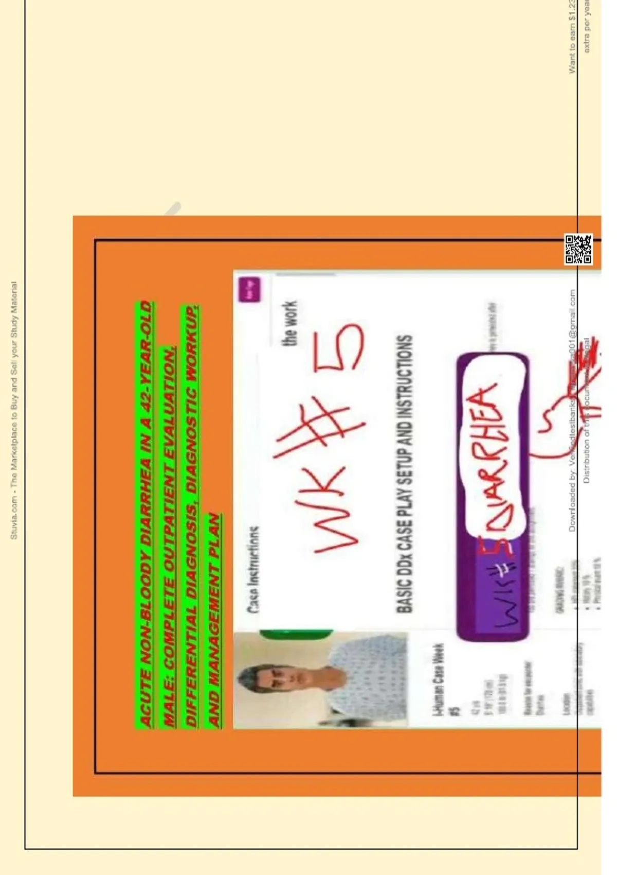 Master the clinical approach to acute gastroenteritis with this comprehensive i-Human case study focused on a 42-year-old male with acute non-bloody diarrhea. Designed for medical, nursing, NP, and PA students, this Week 5 resource delivers a step-by-step outpatient evaluation—from focused history and exam to diagnostics, differentials, and evidence-based management. Here’s What You’ll Learn: Patient Presentation & HPI – Acute onset diarrhea, associated symptoms, dietary history, and absence of red flags Past Medical & Social History – Hypertension, medication use, lifestyle factors, and family history Focused Review of Systems & Physical Exam – Vital signs, abdominal assessment, and key clinical findings Diagnostic Workup Strategy – When to order labs (CBC, CMP) and when to defer stool studies Differential Diagnosis Framework – Compare viral gastroenteritis, foodborne illness, IBS-D, medication-induced diarrhea, and bacterial causes Final Diagnosis & Clinical Reasoning – Synthesizing data to diagnose acute viral gastroenteritis SOAP Note Example – Ready-to-use documentation for outpatient visits Evidence-Based Management Plan – Oral rehydration, BRAT diet, symptomatic relief, and avoidance of unnecessary antibiotics Patient Education & Safety Netting – Hydration guidance, dietary modifications, and warning signs for return Why This Case Study Is Essential for Your Training: Builds clinical reasoning skills for common outpatient GI presentations Teaches appropriate diagnostic stewardship—when to test and when to treat empirically Provides a clear, structured approach to uncomplicated acute diarrhea Prepares you for clinical rotations, shelf exams, and board certifications (USMLE, NCLEX, PANCE) Includes real-world templates for SOAP notes and patient instructions Perfect For: Medical and physician assistant students Nursing students (RN, NP) in primary or urgent care tracks i-Human Week 5 and similar clinical case study assignments Anyone preparing for exams or clinical skills assessments Get your copy today and confidently manage acute diarrheal illness in the outpatient setting!