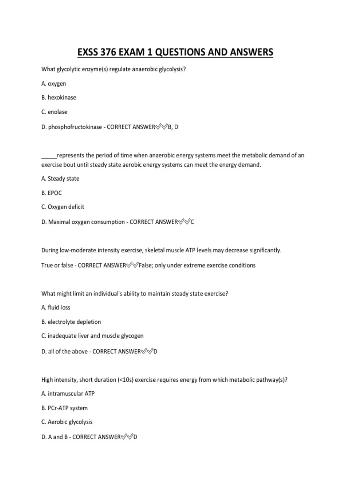 EXSS 376 EXAM 1 QUESTIONS AND ANSWERS What glycolytic enzyme(s) regulate anaerobic glycolysis? A. oxygen B. hexokinase C. enolase D. phosphofructokinase - CORRECT ANSWERB, D
