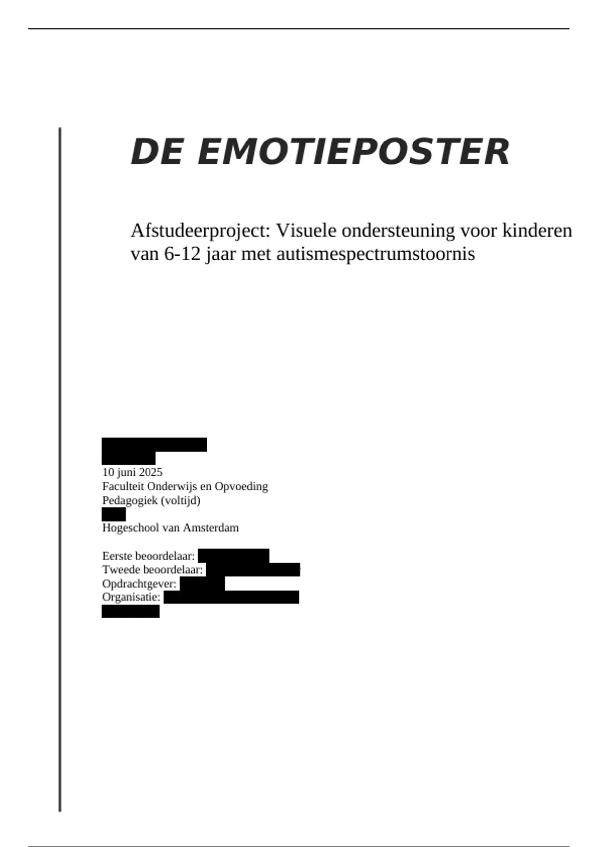 Deze scriptie richt zich op het gebruik van visuele ondersteuning bij kinderen van 6–12 jaar met een autismespectrumstoornis (ASS). Het onderzoek onderzoekt hoe visuele hulpmiddelen kunnen bijdragen aan het herkennen en reguleren van de emoties.