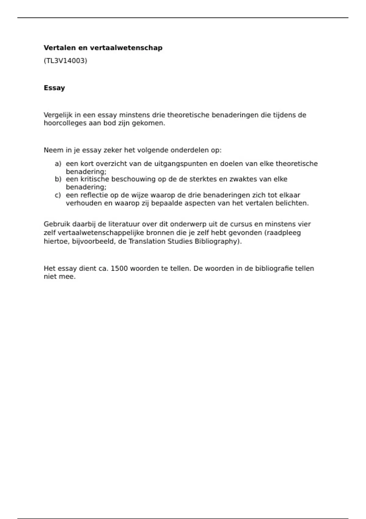Het essay dient ca. 1500 woorden te tellen. De woorden in de bibliografie tellen