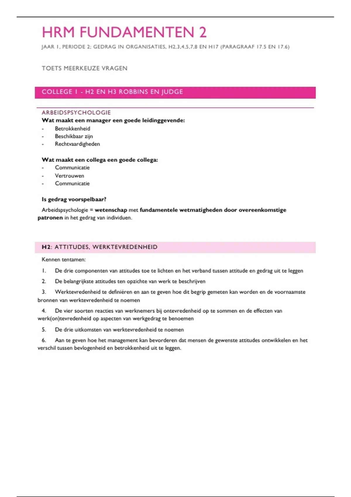 Samenvatting college + flash cards! Deze samenvatting bevat alle colleges (1 t/m 4) én de bijbehorende slides van het vak Fundamenten van HRM 2, inclusief wat de docent zélf heeft benadrukt als belangrijk! Onderdeel van het eerste jaar van de AD of Bachelor HRM (deeltijd) aan de Hanzehogeschool Groningen. Het document behandelt alle relevante tentamenstof, waaronder: H2, H3, H4, H5, H7, H8, H17.5 en H17.6 uit het boek Gedrag in organisaties van Stephen P. Robbins en Timothy A. Judge. En 3 readers t.b.v. college 4: Bevlogenheid van werknemers gemeten artikel, Geef een nieuwe draai aan uw werk artikel en Werken aan bevlogenheid artikel.