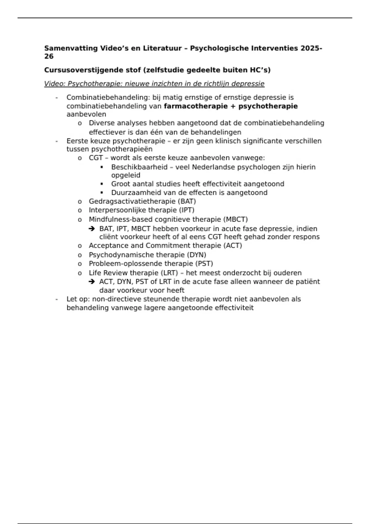 Samenvatting Video’s en Literatuur – Psychologische Interventies 2025-