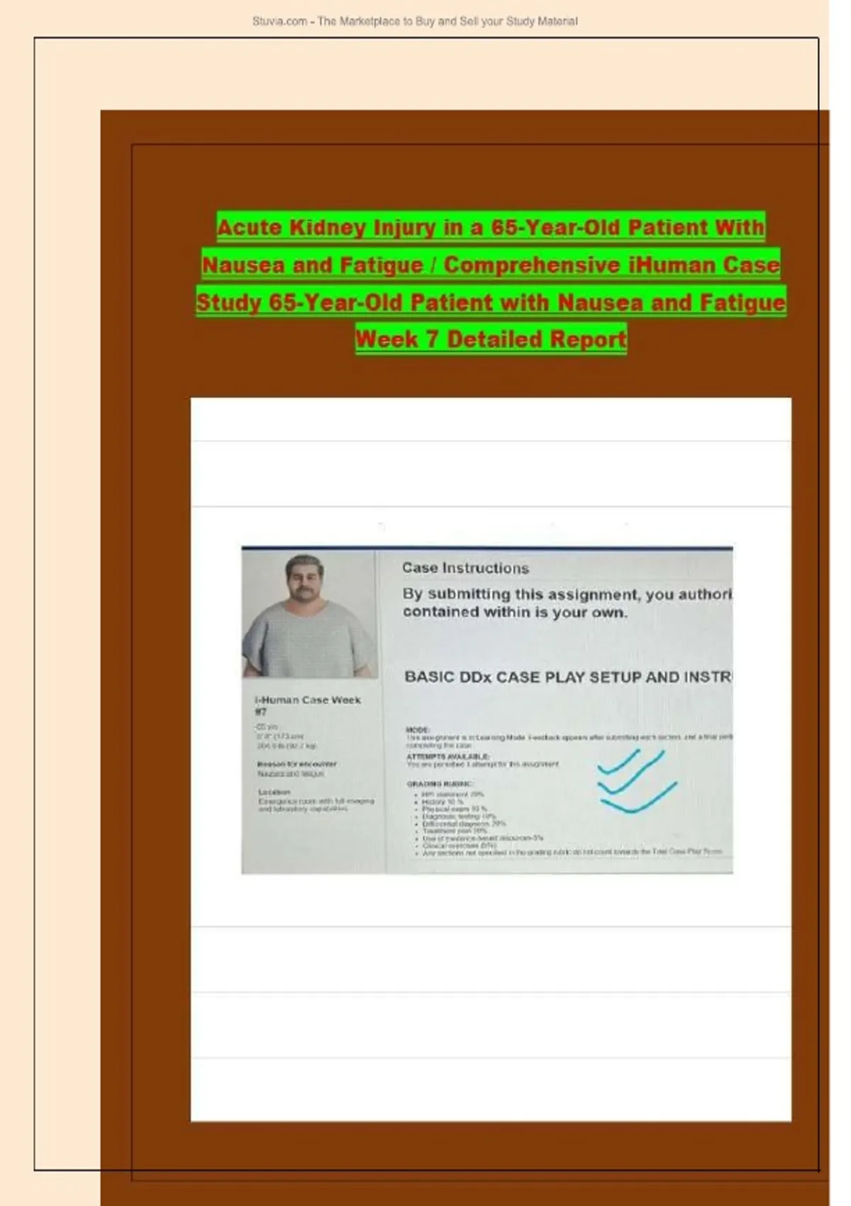 Struggling with your iHuman case study on Acute Kidney Injury? This comprehensive Week 7 guide provides a fully detailed patient report, step-by-step clinical reasoning, diagnosis, treatment plan, and patient education for the 65-year-old male presenting with nausea and fatigue. Perfect for nursing and medical students — use this structured case analysis to master clinical reasoning, impress instructors, and boost your grades. Get your copy now and approach your case study with confidence!