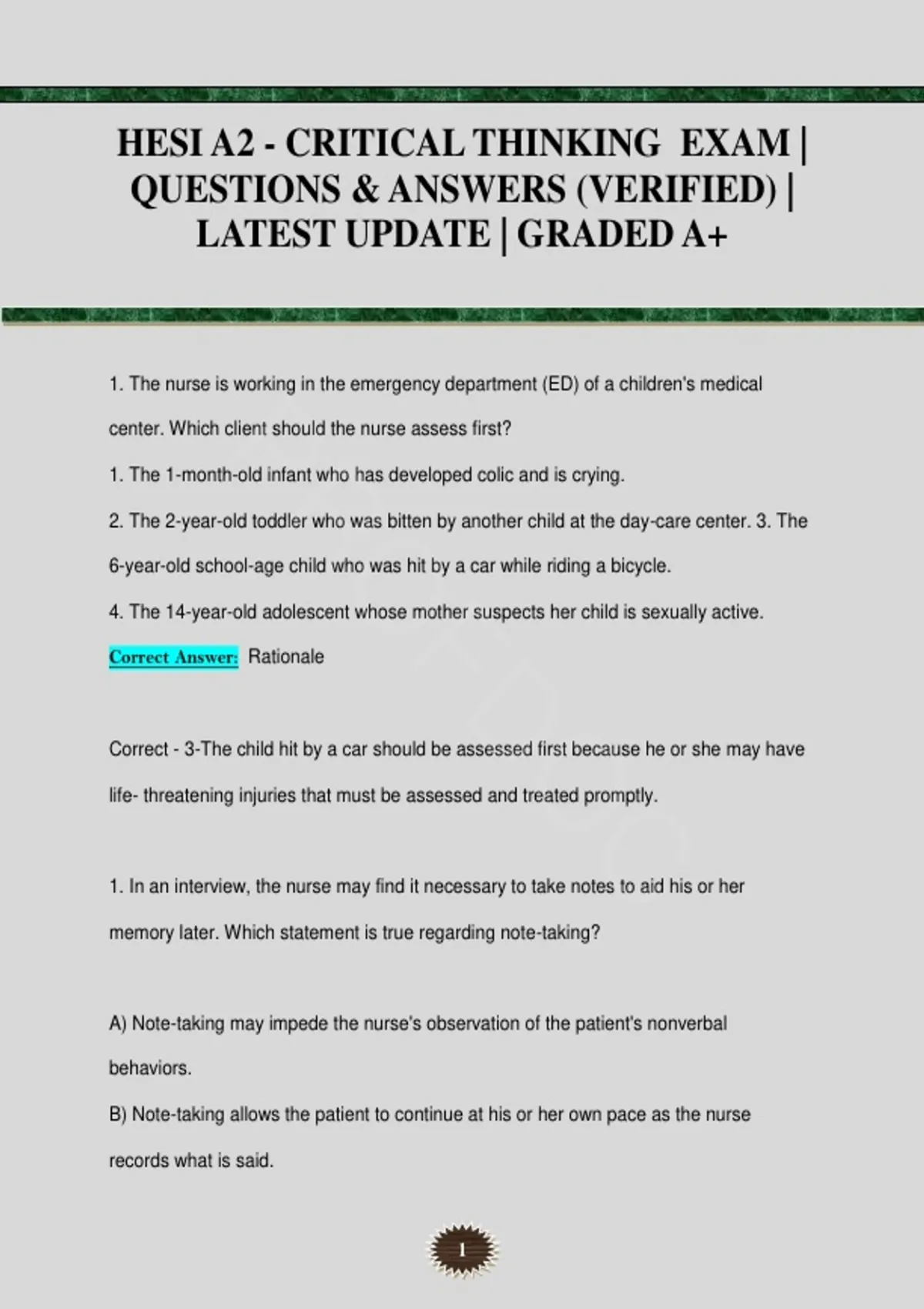 HESI A2 - CRITICAL THINKING