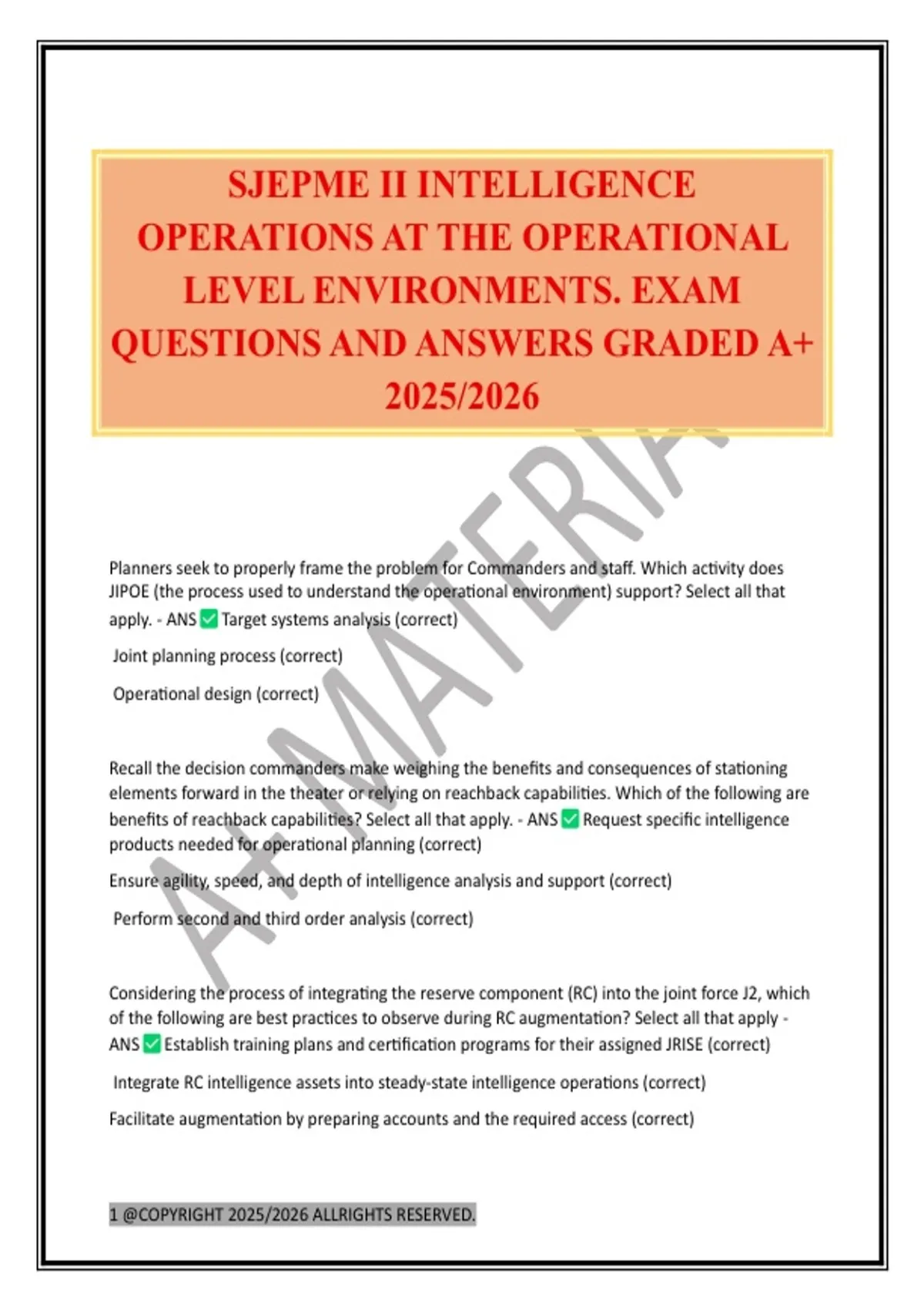 SJEPME II INTELLIGENCE OPERATIONS AT THE OPERATIONAL LEVEL ENVIRONMENTS. EXAM QUESTIONS AND ANSWERS GRADED A+ 2025/2026