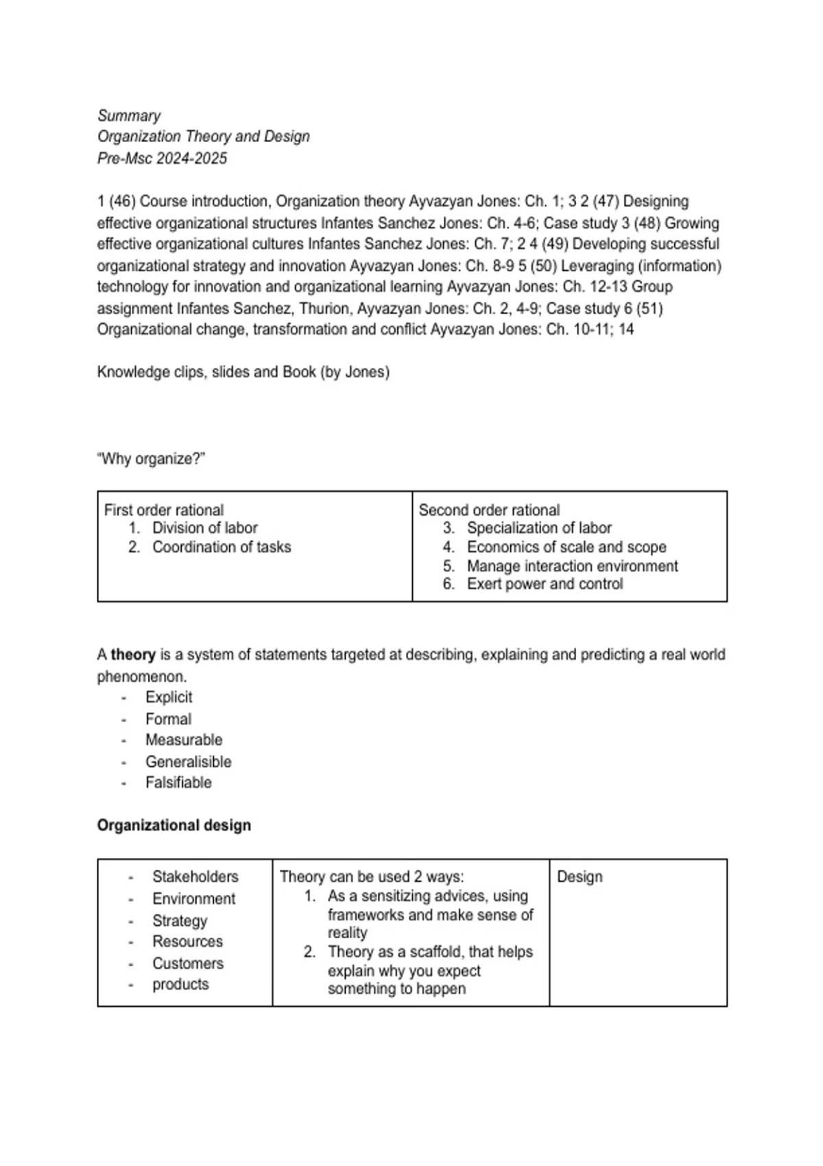 This document provides a brief overview of the course Organization Theory and Design (Pre-MSc 2024–2025), closely aligned with the textbook by Jones. It outlines the weekly structure of the course and introduces core concepts in organization theory, including why organizations exist, division of labor and coordination, organizational design, strategy and innovation, information technology and organizational learning, organizational culture, and organizational change and conflict. Following Jones, the document presents theory as an analytical and design-oriented framework used to describe, explain, and predict organizational phenomena, with a strong focus on differentiation, specialization, and structural design within organizations.