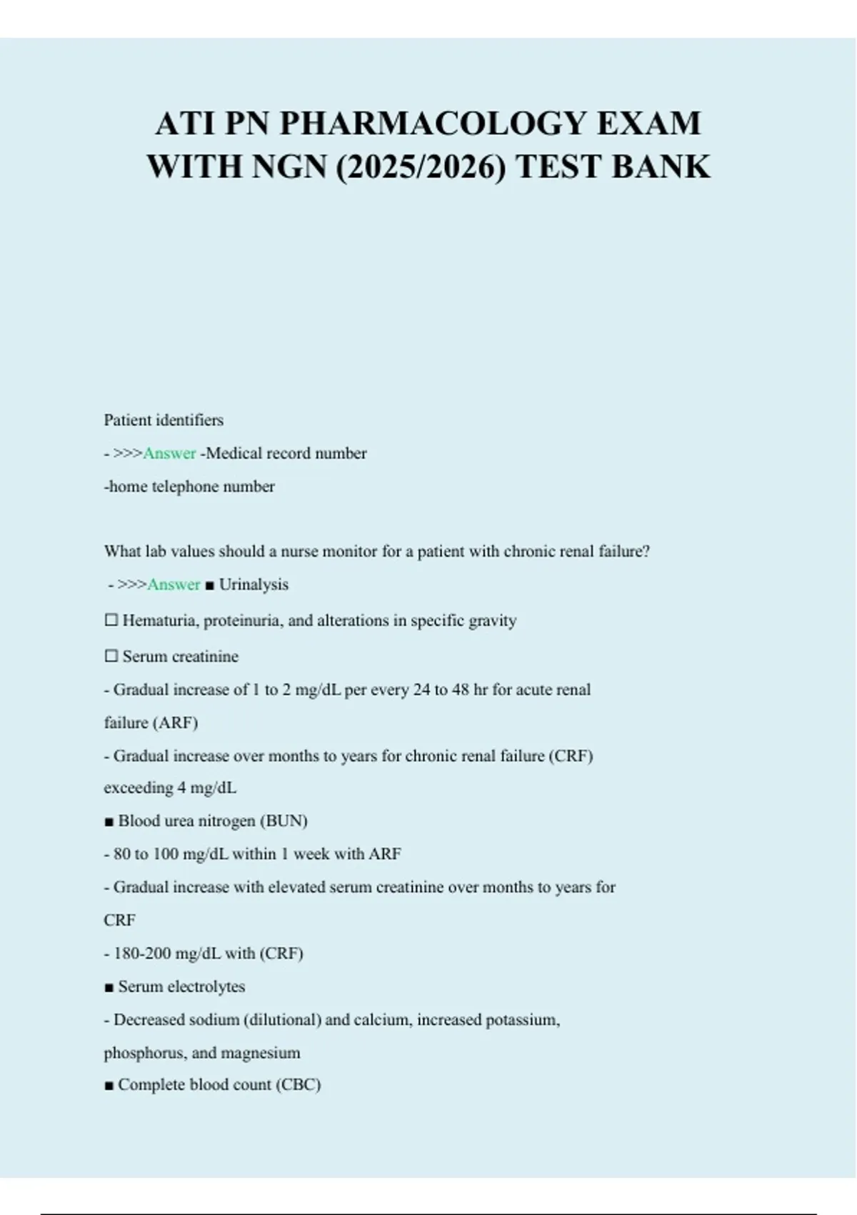 Comprehensive test bank for the ATI Pharmacology Exam with Next Generation NCLEX (NGN) questions. Includes verified questions and answers covering medication classifications, pharmacokinetics, patient safety, nursing interventions, and exam-focused content to support mastery and pharmacology exam succe