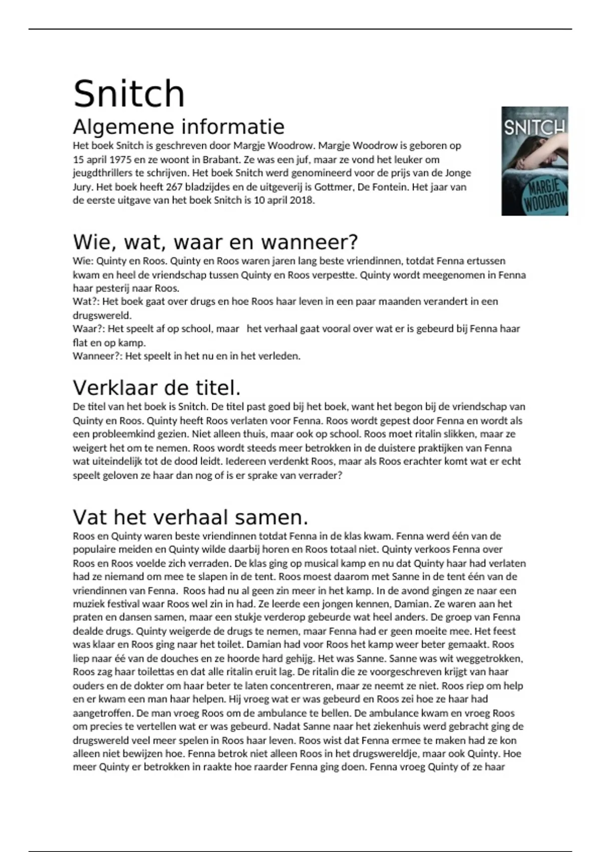 Het boek Snitch is geschreven door Margje Woodrow. Margje Woodrow is geboren op