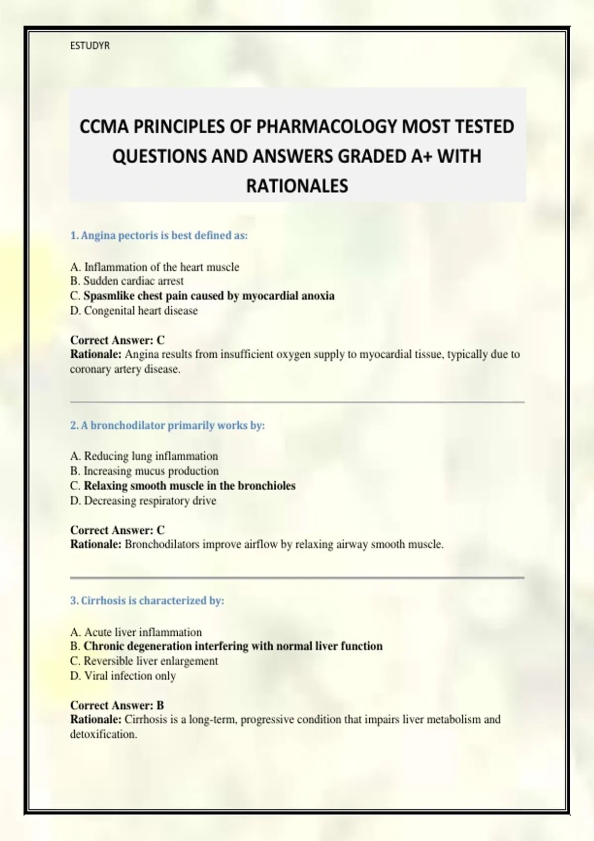 CCMA PRINCIPLES OF PHARMACOLOGY MOST TESTED QUESTIONS AND ANSWERS GRADED A+ WITH RATIONALES