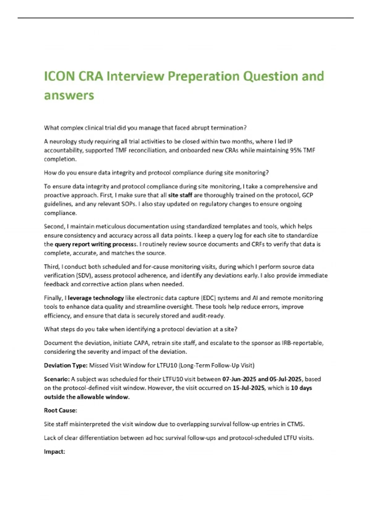 ICON CRA Interview Preperation Question and answers What complex clinical trial did you manage that faced abrupt termination? A neurology study requiring all trial activities to be closed within two months, where I led IP accountability, supported TMF reconciliation, and onboarded new CRAs while maintaining 95% TMF completion. How do you ensure data integrity and protocol compliance during site monitoring? To ensure data integrity and protocol compliance during site monitoring, I take a comprehensive and proactive approach. First, I make sure that all site staff are thoroughly trained on the protocol, GCP guidelines, and any relevant SOPs. I also stay updated on regulatory changes to ensure ongoing compliance.