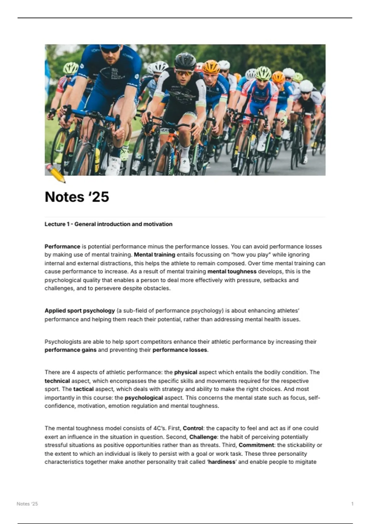 Ik heb de aantekeningen van de slides samen met de uitleg eromheen uitgebreid uitgewerkt en duidelijk neergezet. Includes: - Lecture 1 - General introduction and motivation - Lecture 2 - perfectionism, goals and self-efficacy - Lecture 3 - Pressure, emotions, and focus - Lecture 4 - Psychological skills training - Lecture 5 - Team dynamics - Lecture 6 - Expertise development and talent selection - Lecture 7 - New directions: Mindset and resilience