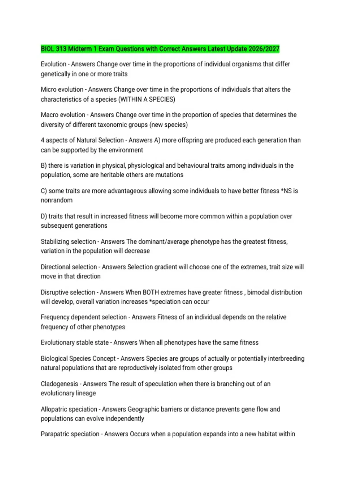 4 aspects of Natural Selection - Answers A) more offspring are produced each generation than