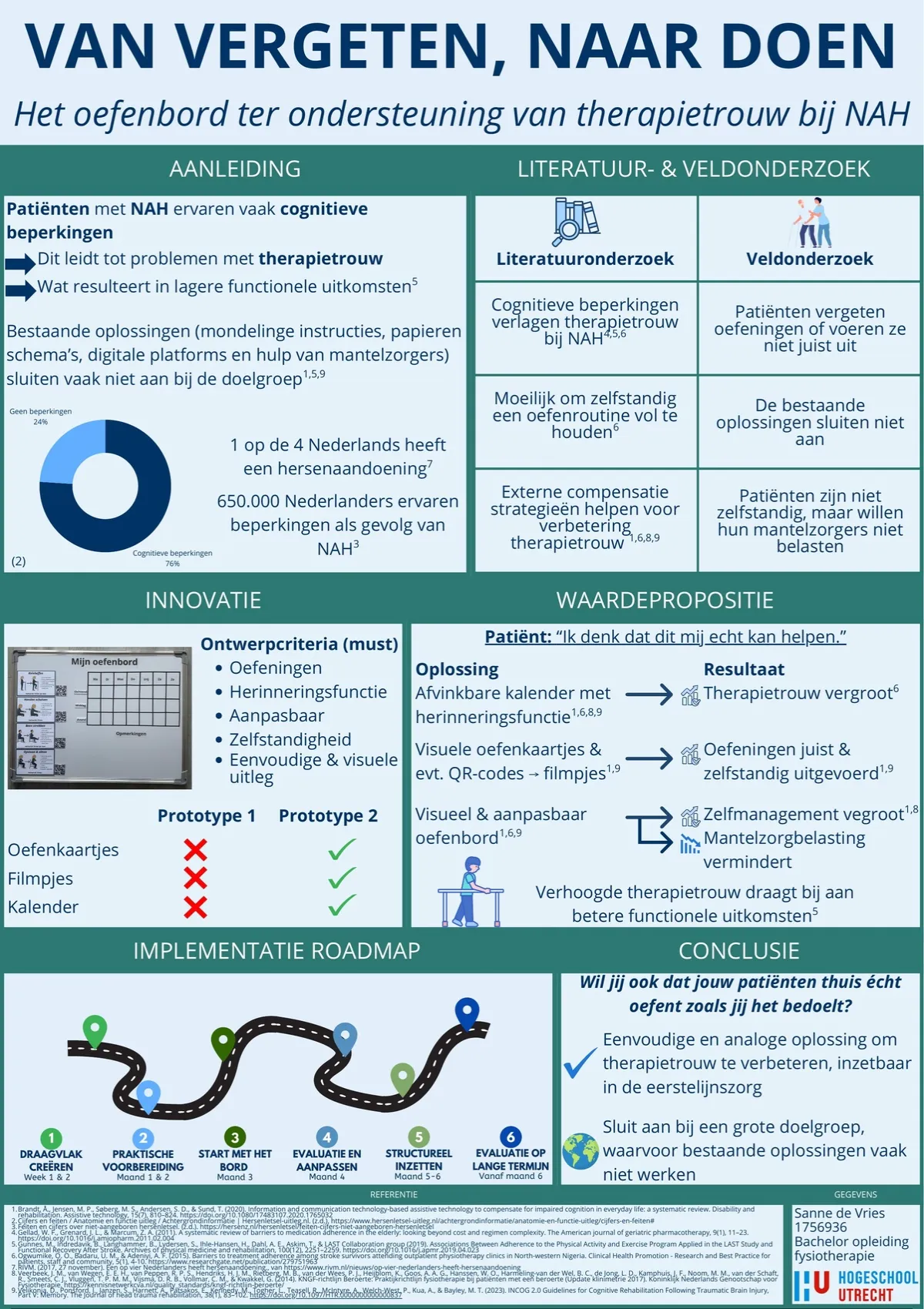 Voor mijn innovatie project aan de Hogeschool Utrecht (HU) voor de opleiding fysiotherapie heb ik een innovatie plan gemaakt. Dit heb ik gebaseerd op een probleem die ik in de eerstelijns praktijk tegen kwam. Ik heb dit innovatieplan moeten pitch met behulp van een poster. Dit heb ik afgerond met een eindcijfer 9. Het probleem wat ik in de praktijk tegen kwam, was dat patiënten/cliënten met NAH problemen hadden met therapietrouw. Dit ben ik verder gaan uitzoeken doormiddel van literatuur- en veldonderzoek. Hier vanuit heb ik een prototype ontwikkeld. Deze poster kan je gebruiken ter ondersteuning van het maken van je eigen innovatie project en poster of als je informatie wil opdoen voor het verbeteren van de therapietrouw bij deze doelgroep.