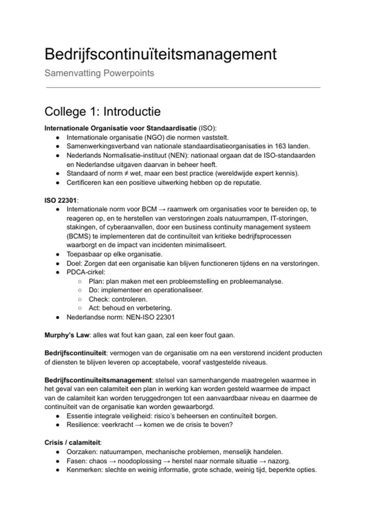 Samenvatting - Bedrijfscontinuïteitsmanagement