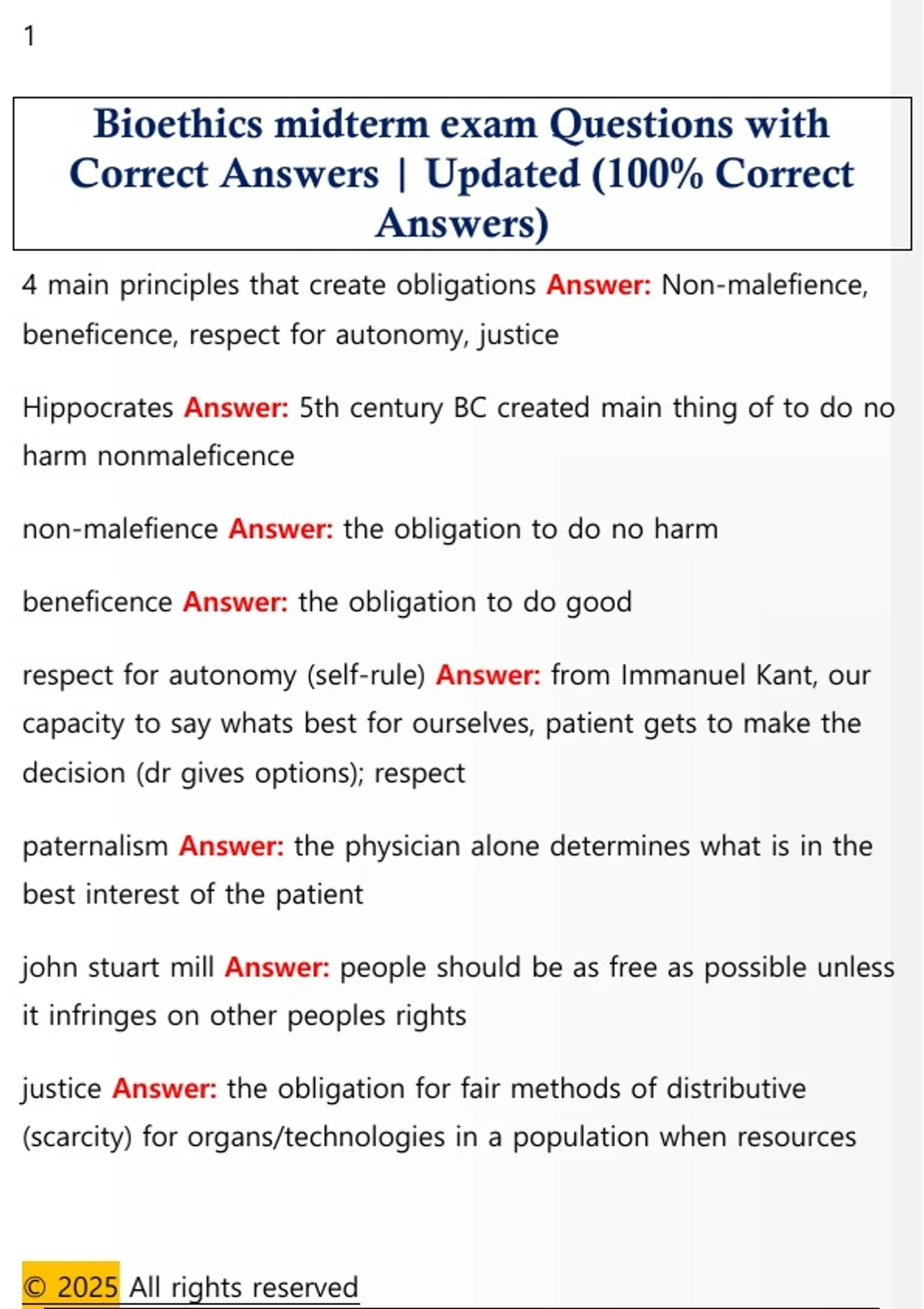 Bioethics midterm exam Questions with Correct Answers | Updated (100% Correct Answers)
