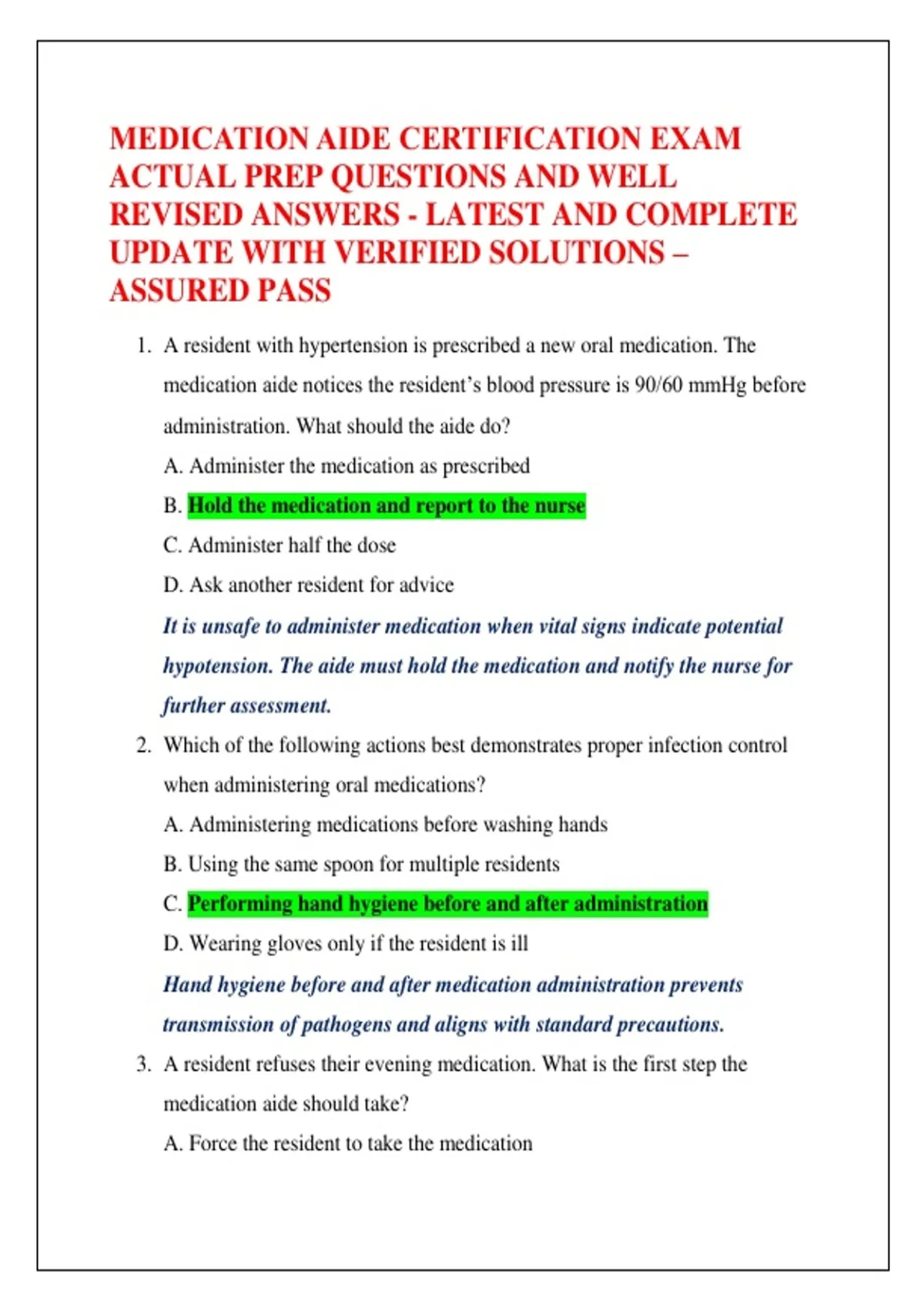 1. A resident with hypertension is prescribed a new oral medication. The