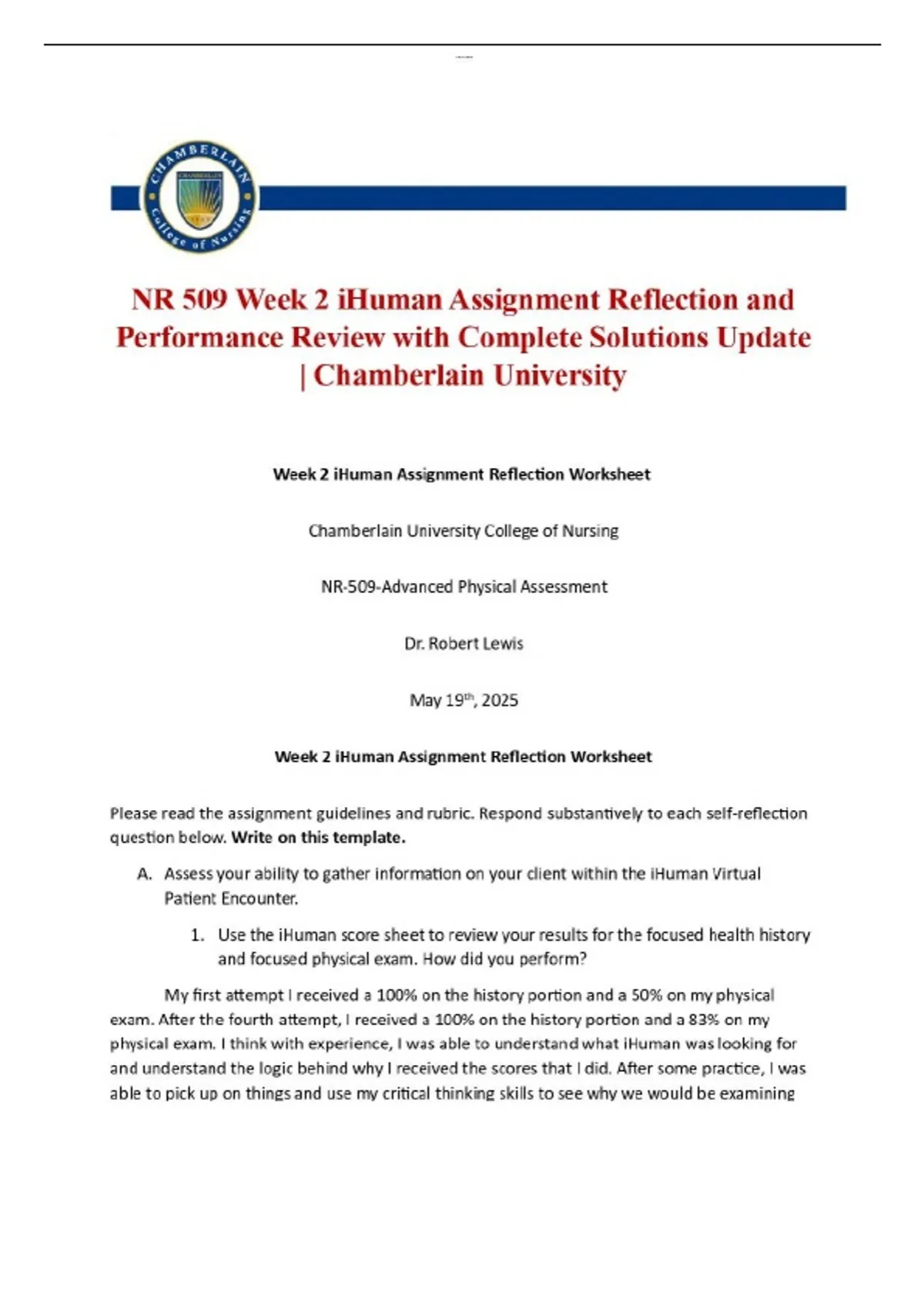 NR 509 Week 2 iHuman Assignment Reflection and Performance Review with Complete Solutions Update | Chamberlain University