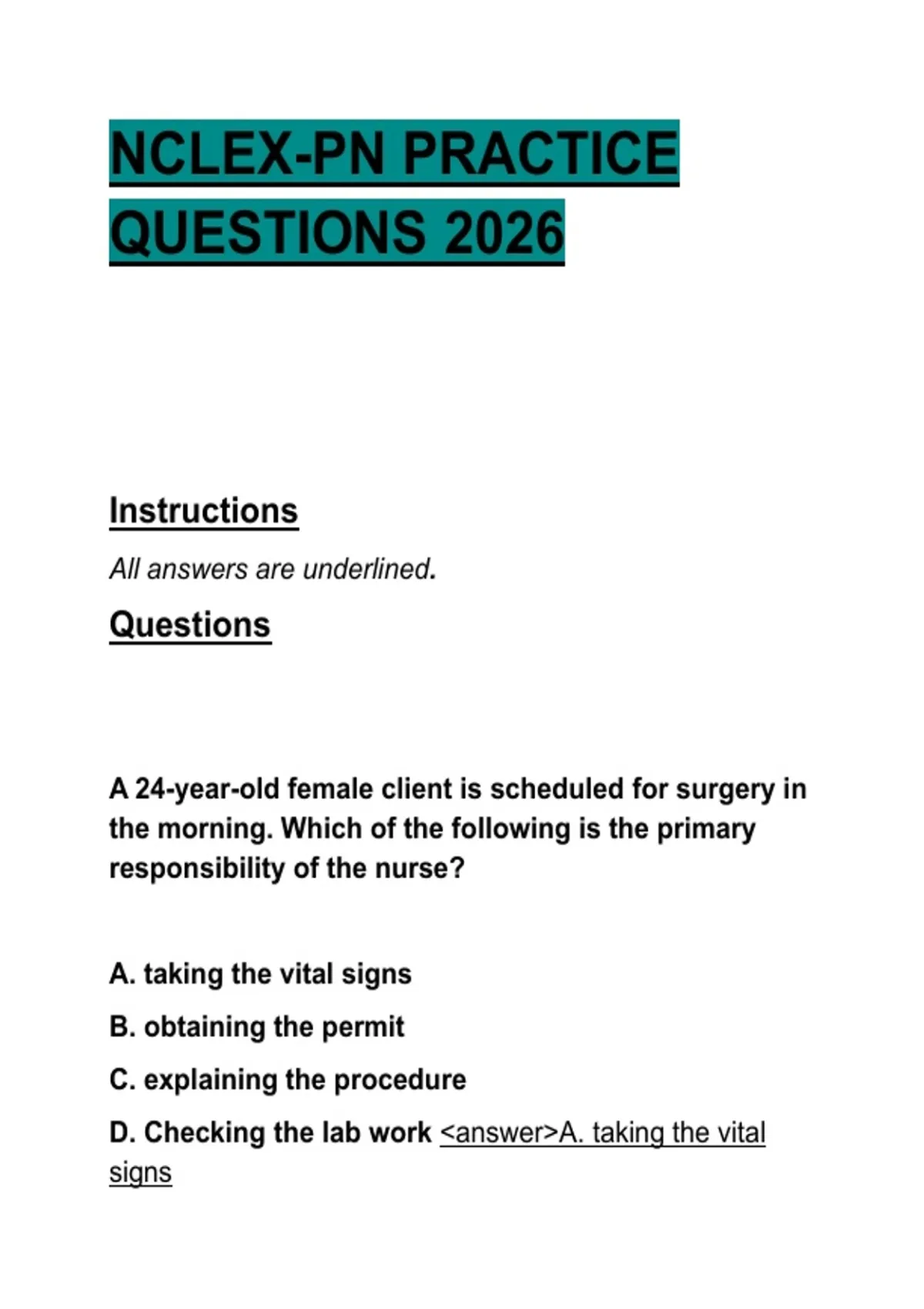 This document contains an extensive collection of NCLEX-PN–style practice questions with clearly underlined correct answers and concise rationales. The questions cover a broad range of practical nursing topics, including medical-surgical nursing, pharmacology, pediatrics, maternity, mental health, leadership, delegation, and emergency care, making it a thorough review resource for exam preparation. The material is well suited for PN students preparing for the NCLEX-PN exam or for reinforcing clinical reasoning and prioritization skills commonly tested on licensure exams.